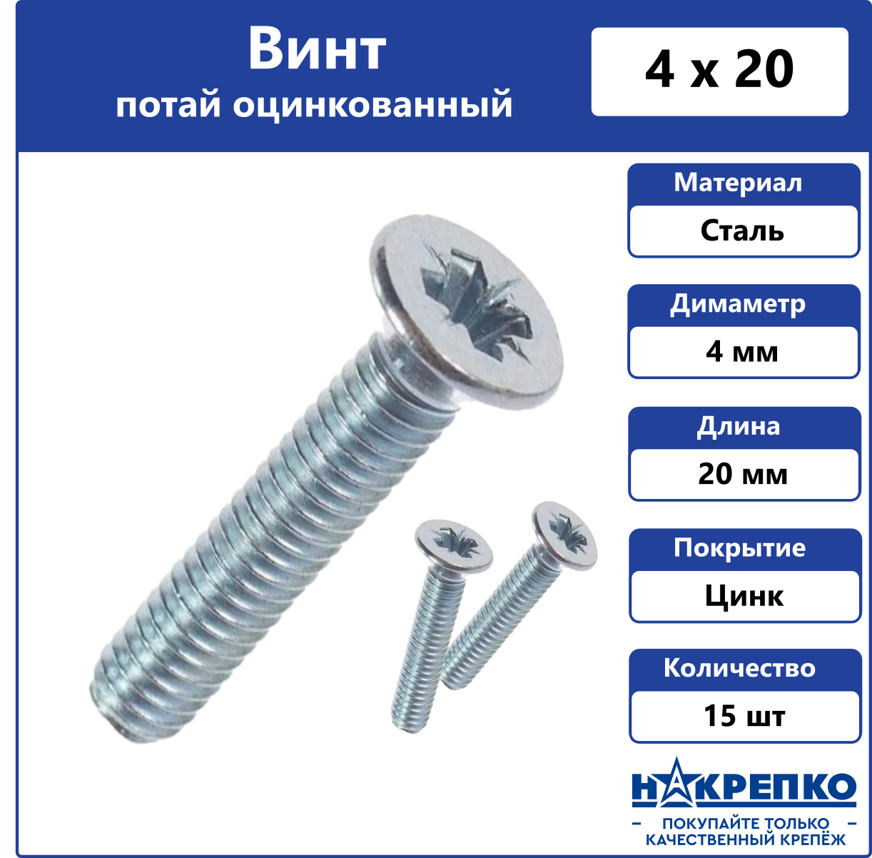 Винт потайной М4 х 20 мм оцинкованный 15 шт Накрепко информация:
