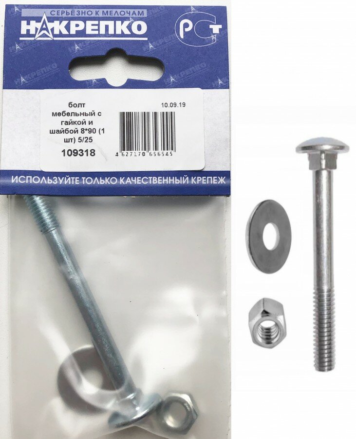 Болт мебельный с гайкой и шайбой М8 х 90 мм 1 шт Накрепко информация: