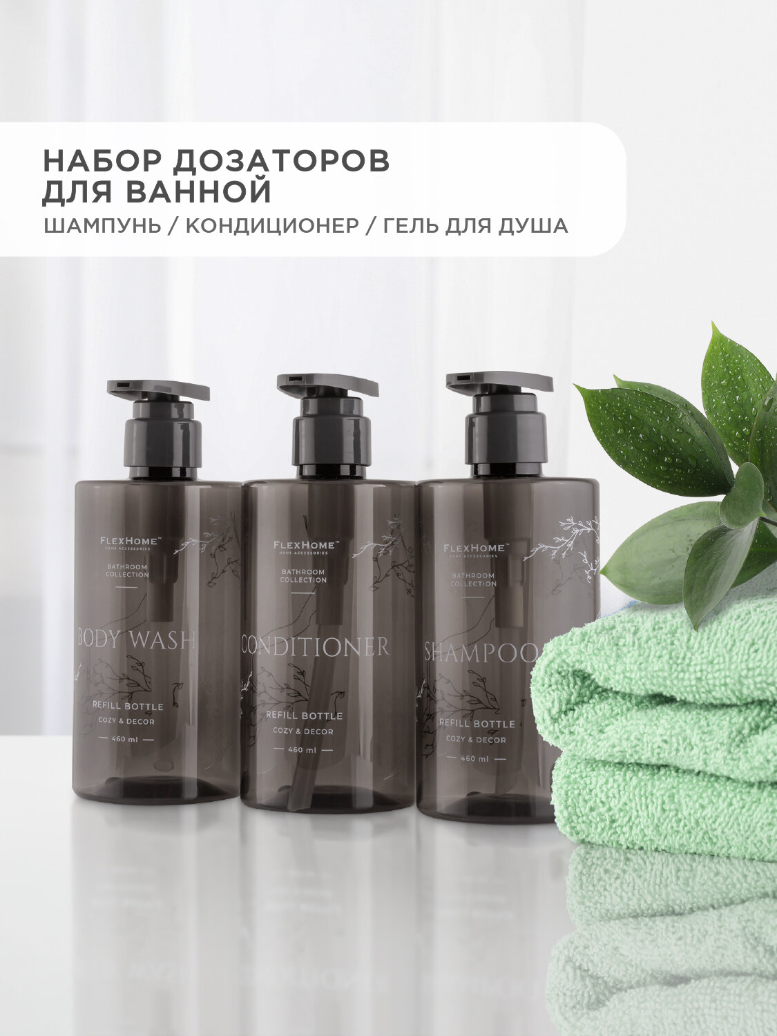10 цен на Набор дозаторов для ванной 3 штуки по 460 мл из прозрачного черного пластика, FlexHome, с шелкографией, принт 657