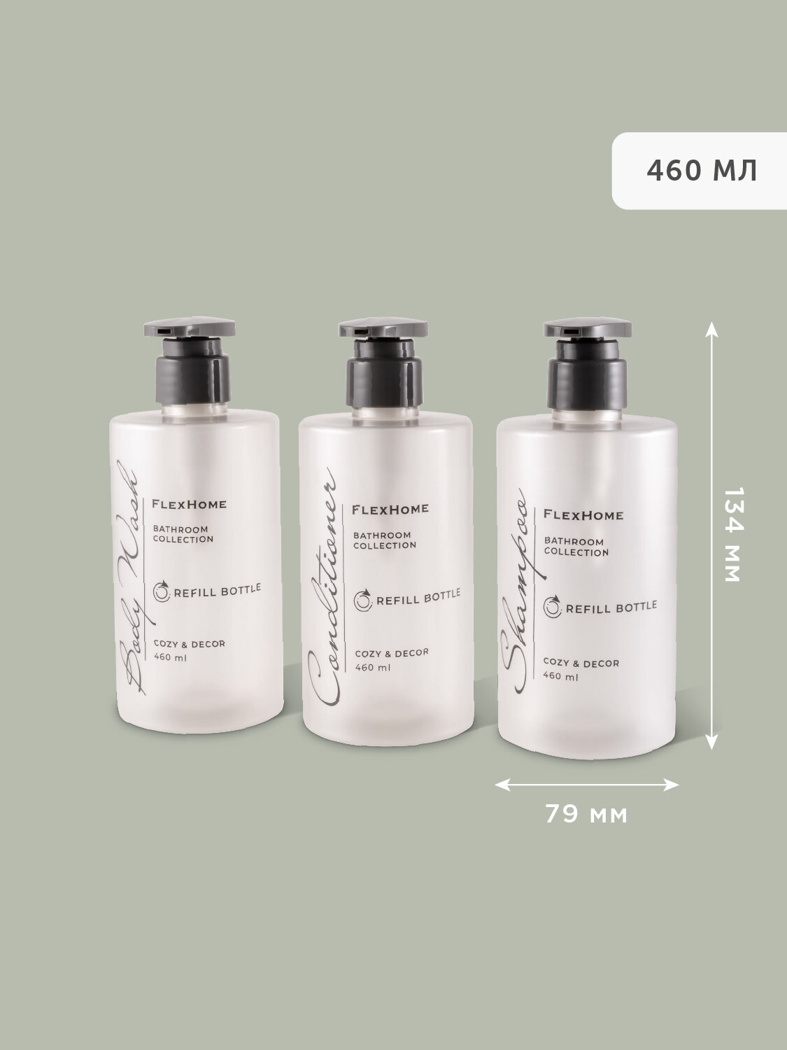 Набор дозаторов для ванной 3 штуки по 460 мл из прозрачного белого пластика, FlexHome, с шелкографией информация: