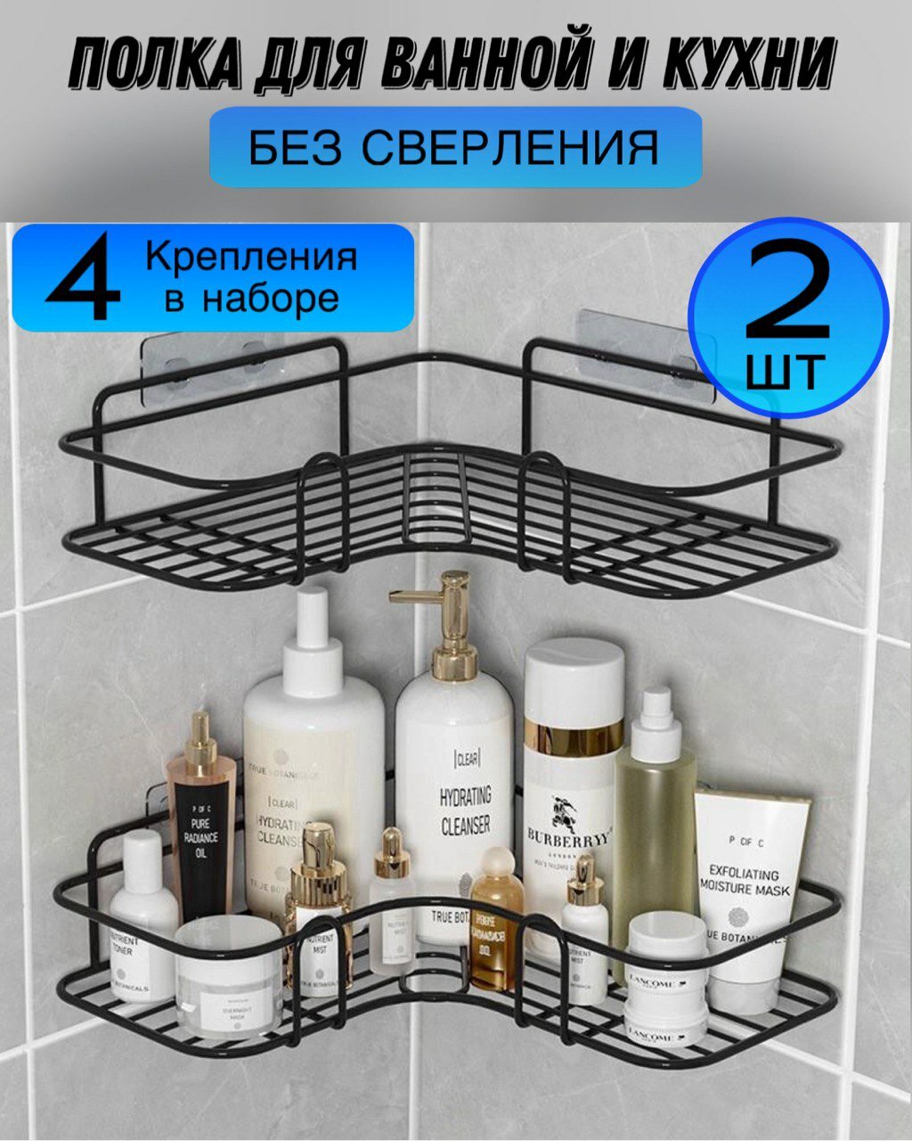 Отзывы на Полка для ванной, кухни без сверления. Угловая полка, черная 2 шт