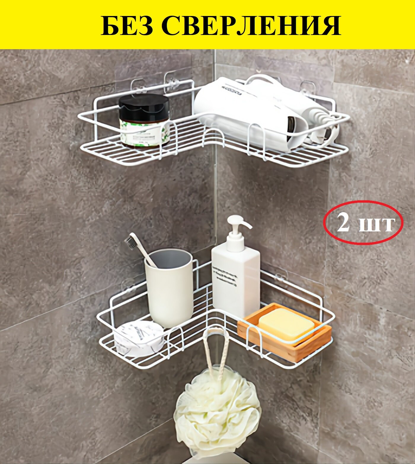 Полка для ванной, без сверления, угловая (1 шт.) цвет белый