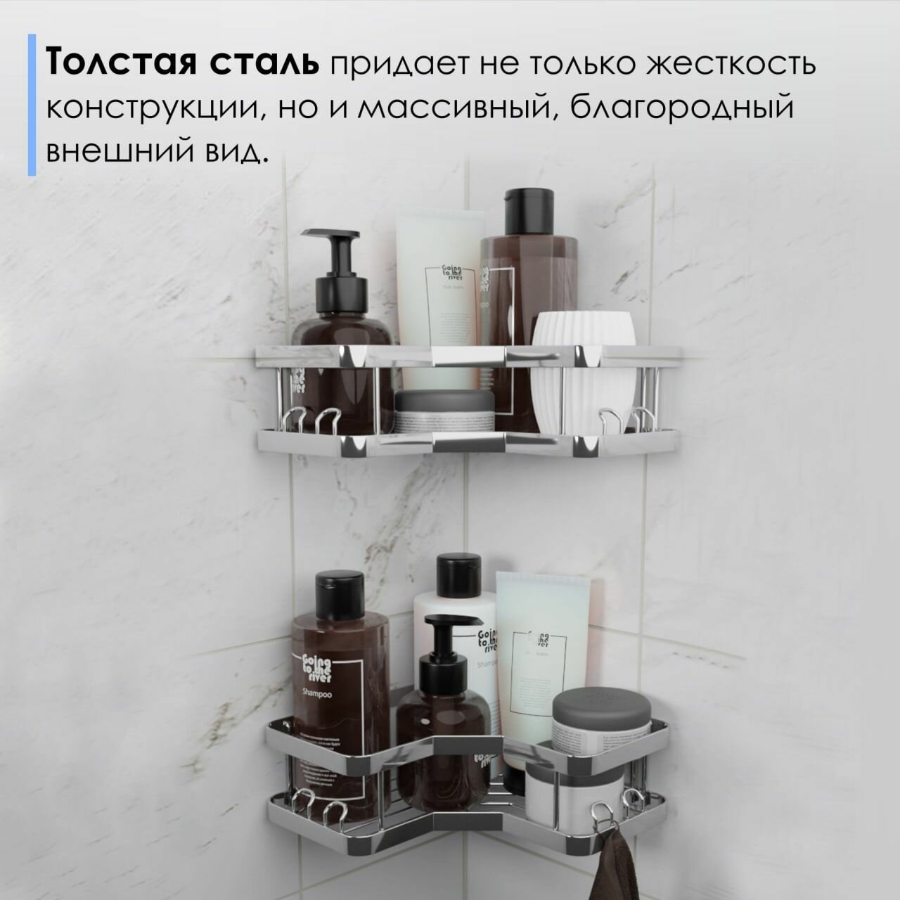 Отзывы на Полка для ванной комнаты угловая самоклеющаяся без сверления / Подвесной органайзер с крючками для душевой кабины, туалета, кухни / Подставка настенная металлическая на липучках, серебренная, 2 шт