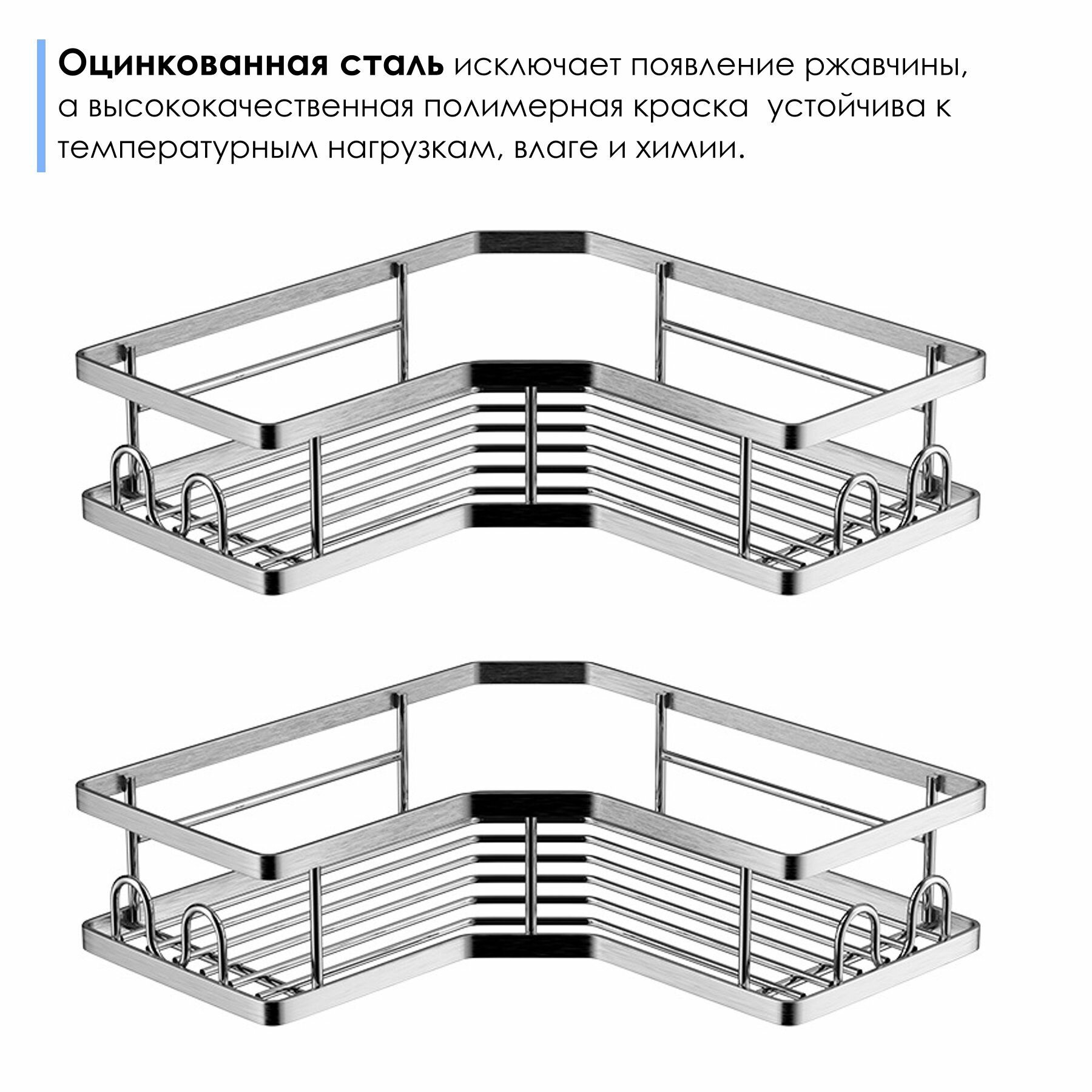 Полка для ванной комнаты угловая самоклеющаяся без сверления / Подвесной органайзер с крючками для душевой кабины, туалета, кухни / Подставка настенная металлическая на липучках, серебренная, 2 шт информация: