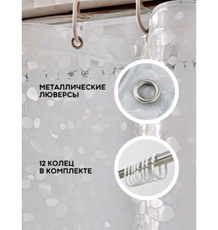 Штора для ванной комнаты с кристаллическим 3D эффектом/ прозрачная, 180*180, с кольцами информация: