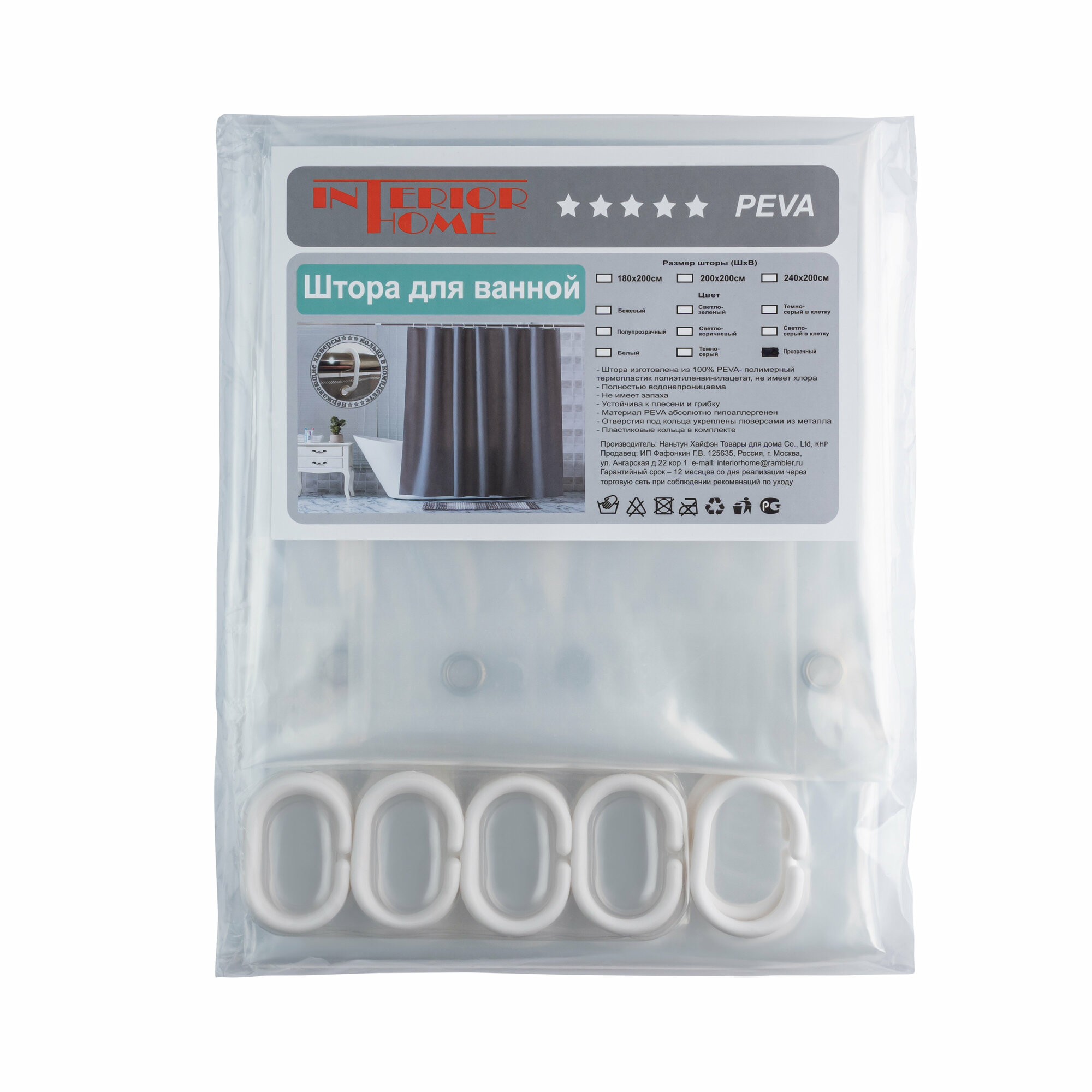 Штора для ванной INTERIORHOME, Ш200хВ200см, прозрачная, материал PEVA информация: