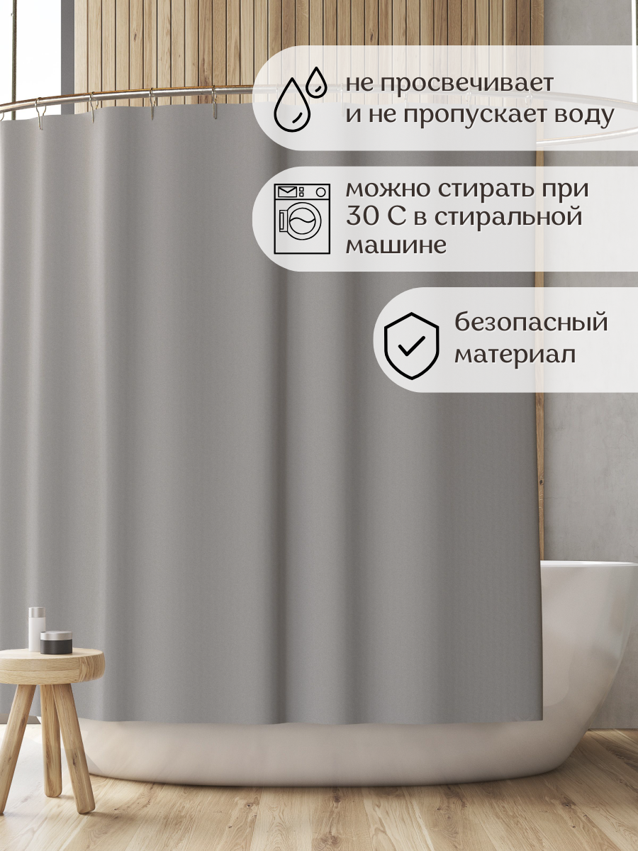 Штора для ванной комнаты тканевая с кольцами, 180х200, занавеска для ванной, шторка для душа, душевая занавеска, серая информация: