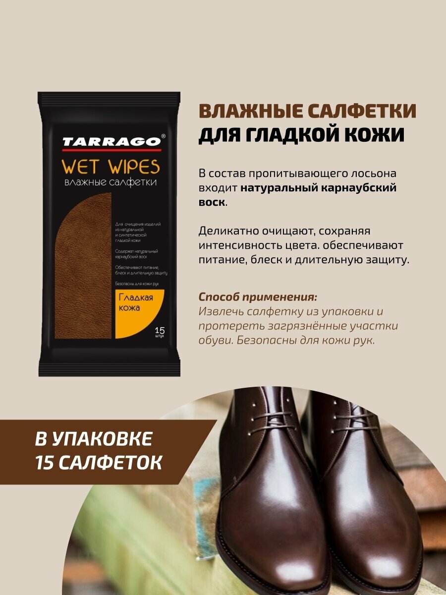 | Дополнительная информация | салфетки влажные чистящие для гладкой кожи. Салфетки деликатно очищают, сохраняя интенсивность цвета изделий из всех видов натуральной и искусственной гладкой кожи. В состав пропитывающего раствора включен карнаубский воск, который придает блеск и обеспечивает дополнительную защиту. |