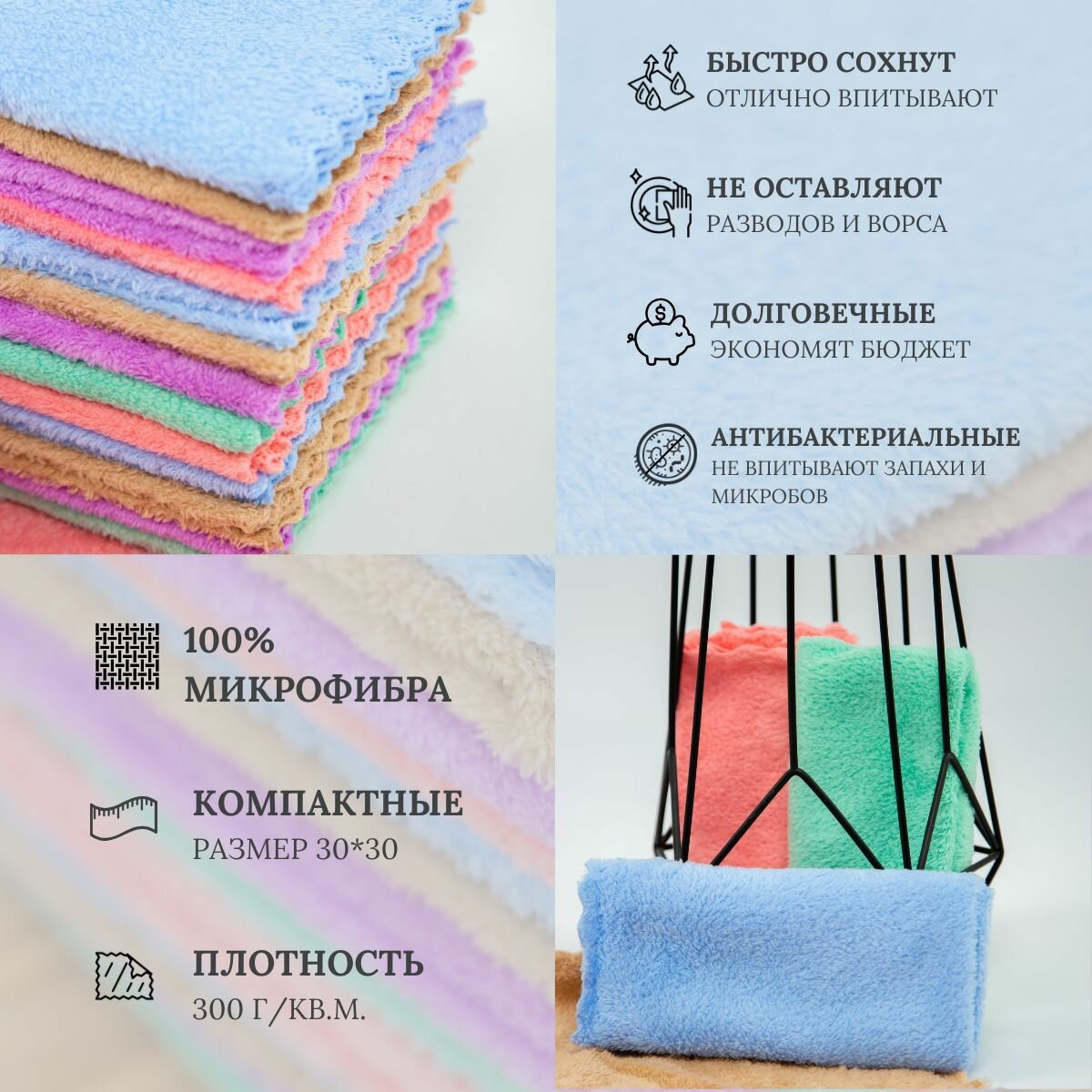 Отзывы на Салфетки для уборки из микрофибры,Разноцветные, 30*30 см, 10шт.