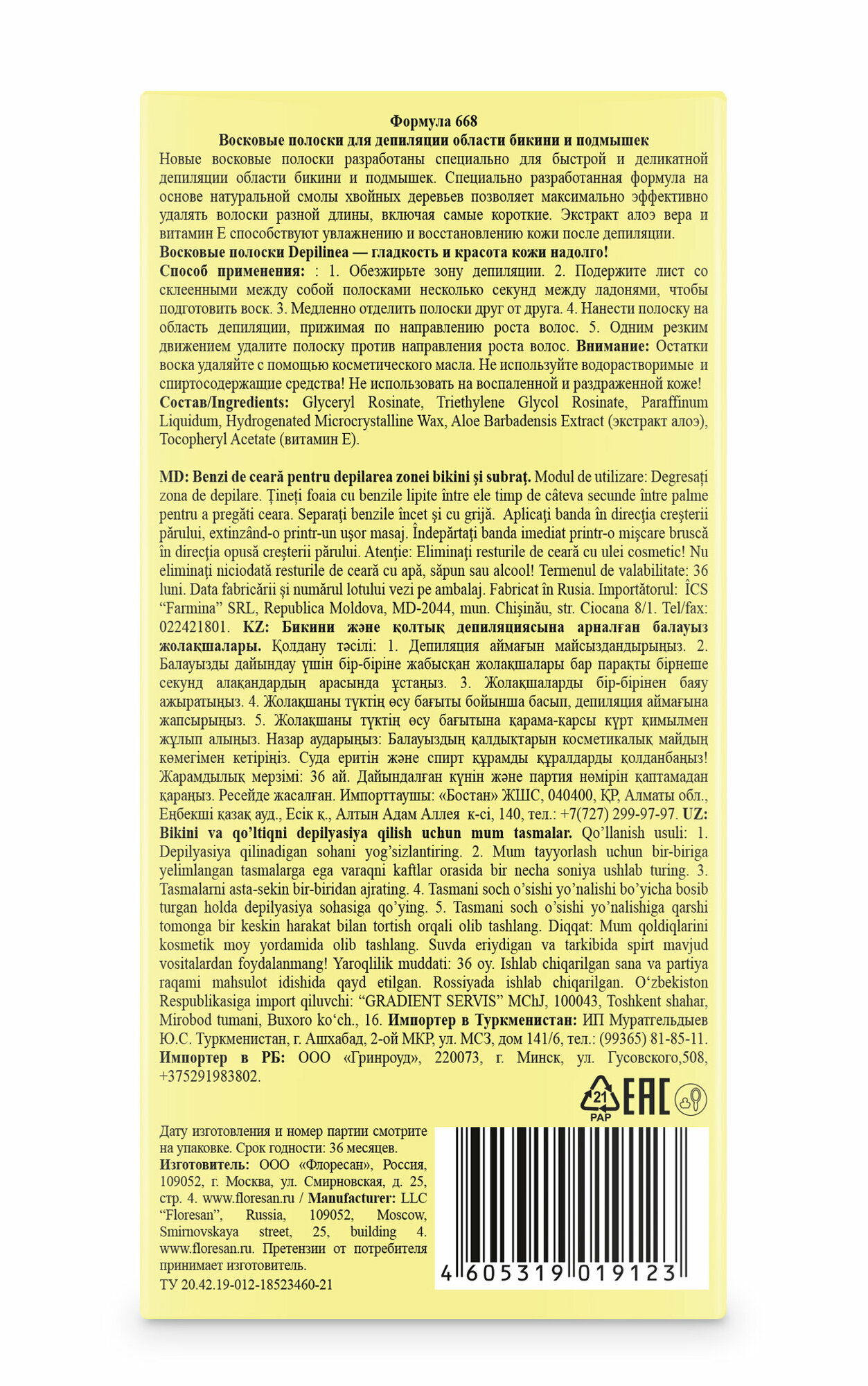 Восковые полоски Floresan для зоны бикини с гелем после депиляции информация: