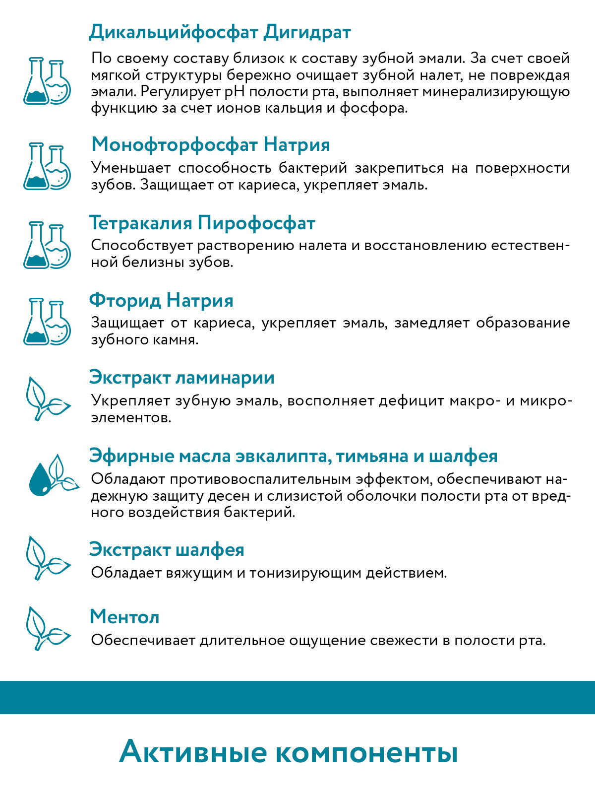 | Состав | Dicalcium Phosphate Dihydrate, Aqua, Sorbitol, Silica, Sodium Coco Sulfate, Cellulose Gum, Aroma, Sodium Monofluorophosphate, Sodium Methylparaben, Sodium Saccharin, Tetrapotassium Pyrophosphate, Sodium Propylparaben, Laminaria Digitata Extract, Menthol, Propolis Extract, Salvia Officinalis (Sage) Leaf Extract, Sodium Fluoride, Clary Sage Oil, Eucalyptus Globulus (Eucalyptus) Oil, Thymus Vulgaris (Common Thyme) Essential Oil Массовая доля фторида (в расчете на молярную массу фтора): 0,1±0,02% |