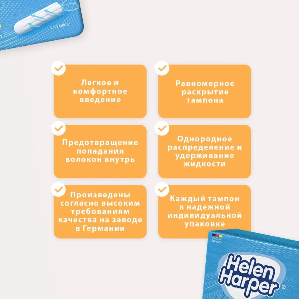 | Дополнительная информация | Тампоны Helen Harper - надежный и удобный выбор для поддержания гигиены в критические дни. Они помогут чувствовать себя комфортно и уверенно в любой ситуации. |