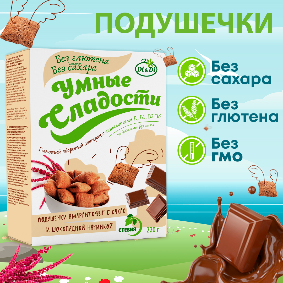 Подушечки амарантовые Умные Сладости с какао и шоколадной начинкой,220 гр( без сахара и без глютена) / полезные сладости / безглютеновые подушечки информация: