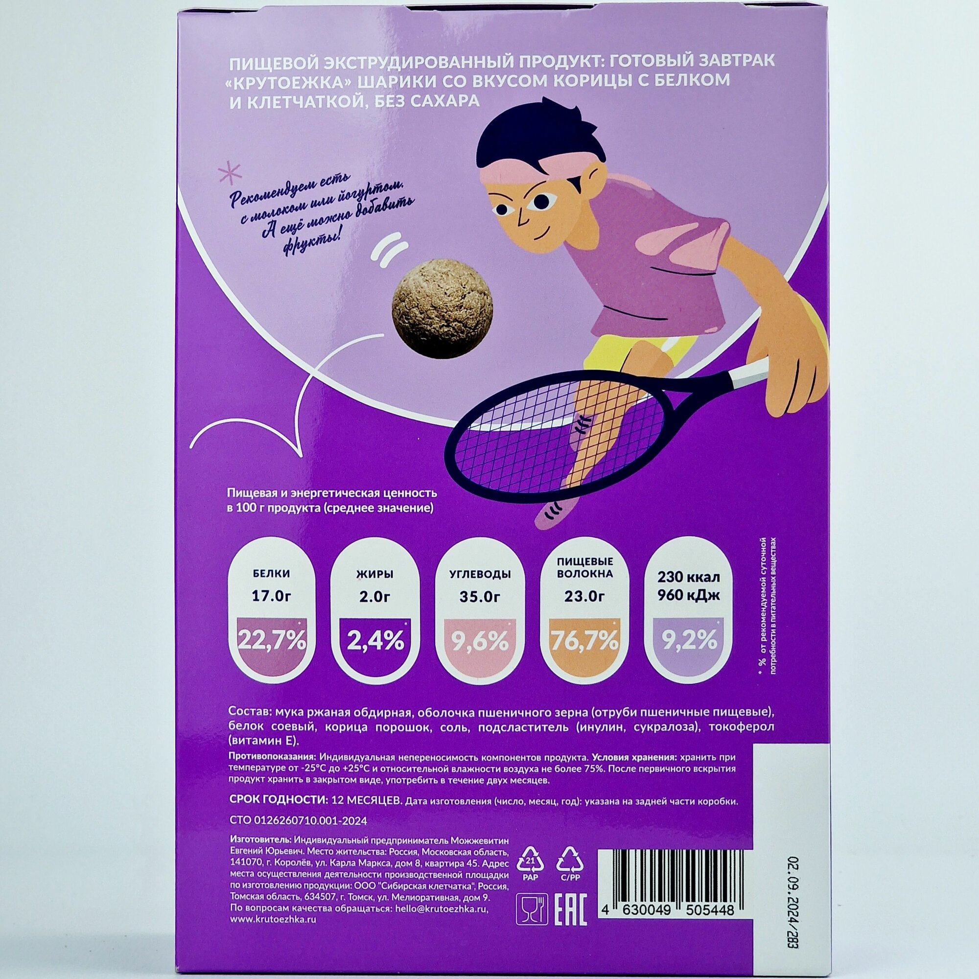 | Состав | Злаковая гранула («Крутоежка» шоколадные шарики с белком и клетчаткой / без сахара): мука ржаная обдирная / оболочка пшеничного зерна (отруби пшеничные пищевые) / белок соевый / какао порошок / соль / ароматизатор натуральный шоколад / подсластитель (инулин / сукралоза) / токоферол (витамин Е). Злаковая гранула («Крутоежка» ванильные шарики с белком и клетчаткой): мука ржаная обдирная / оболочка пшеничного зерна (отруби пшеничные пищевые) / белок соевый / соль / ароматизаторы натуральные: ваниль / сливки / подсластитель (инулин / сукралоза) / токоферол (витамин Е) |