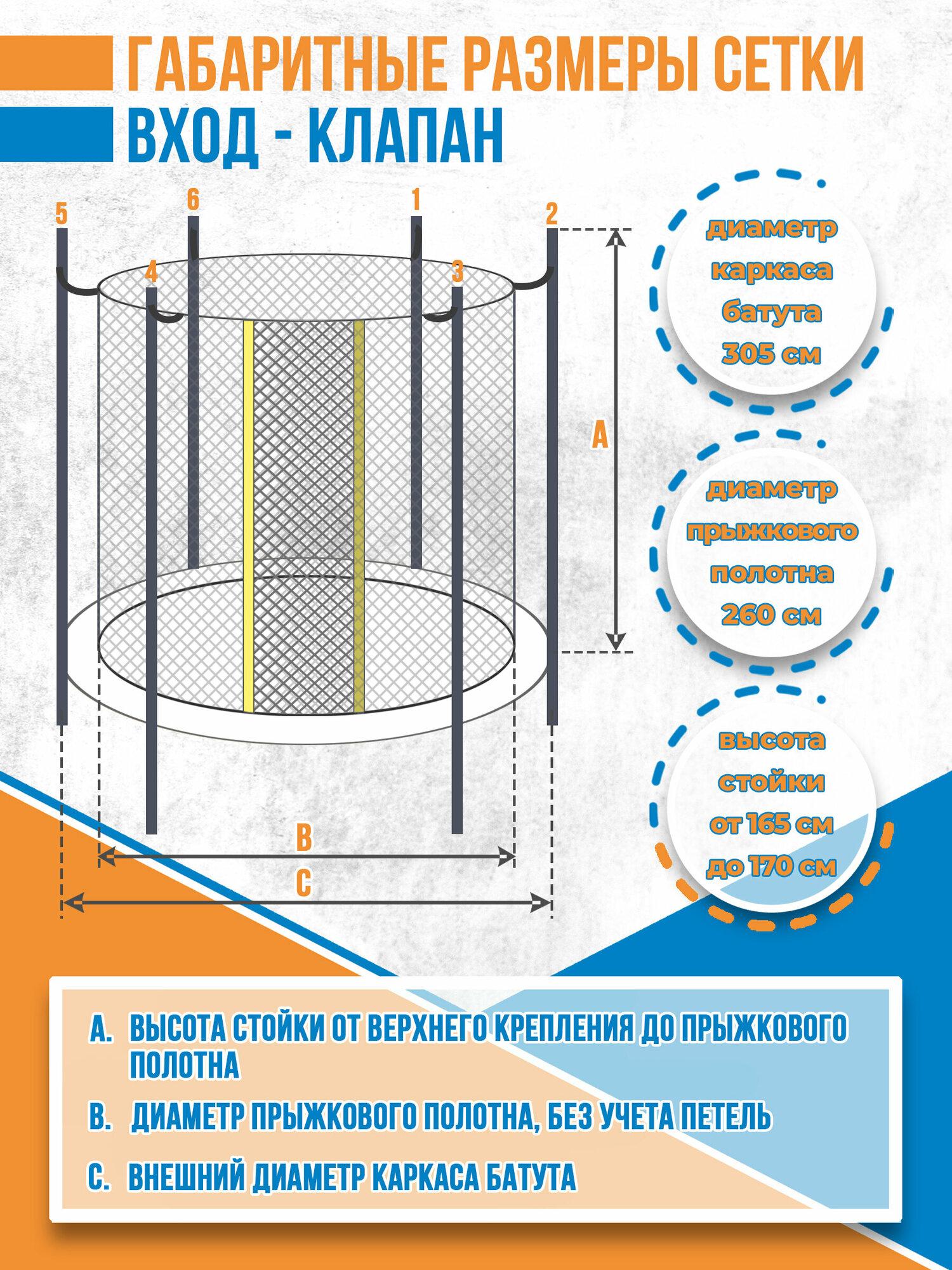 Сетка внутренняя для батута 10 футов - на диаметр прыжкового полотна 260 см, 6 стоек, клапан информация: