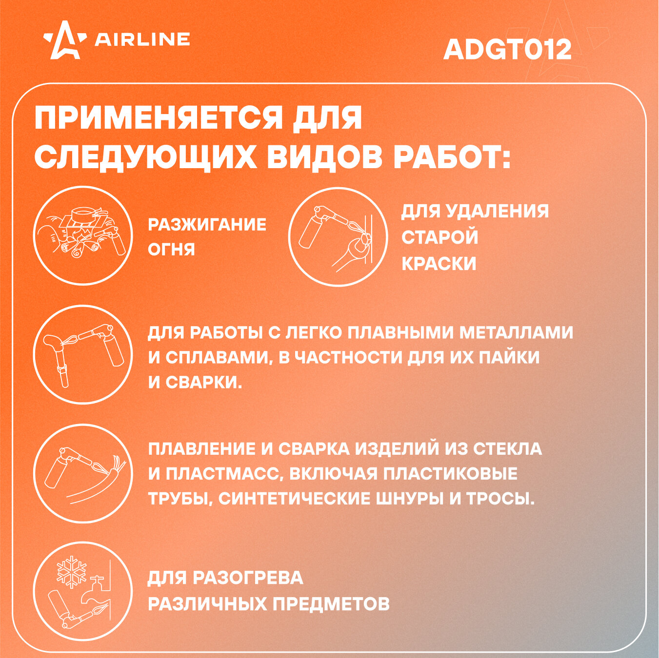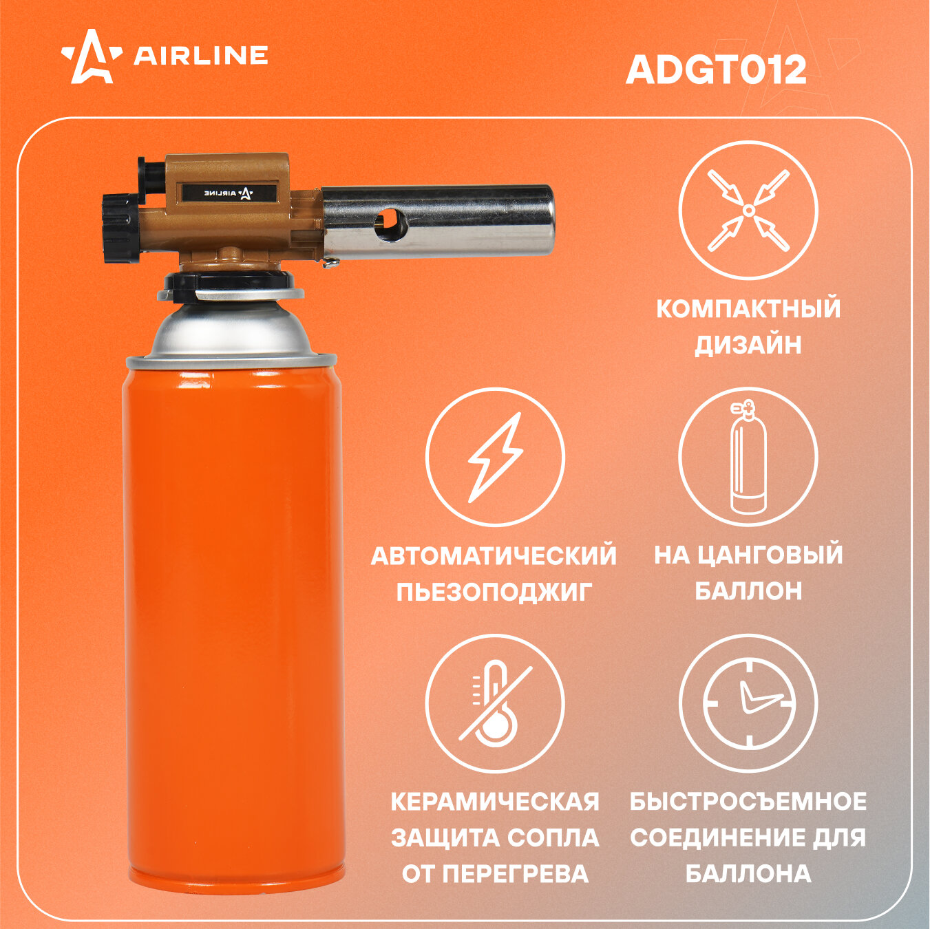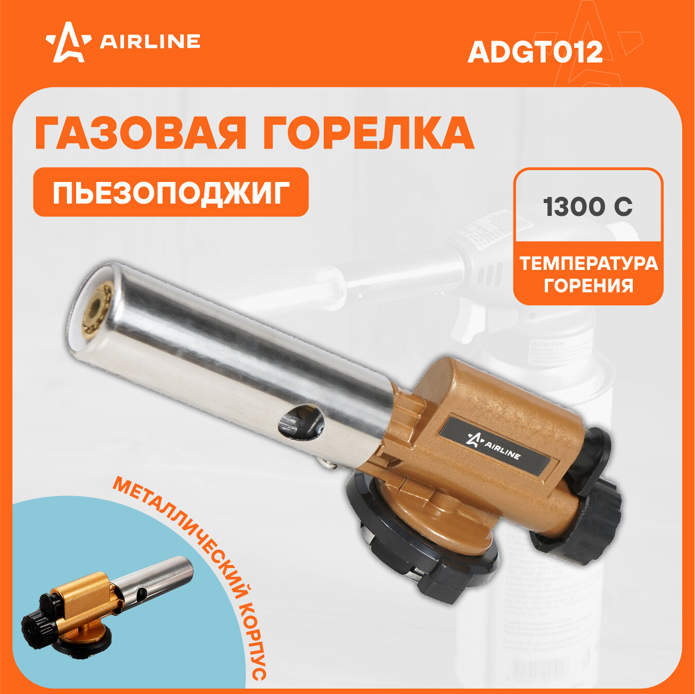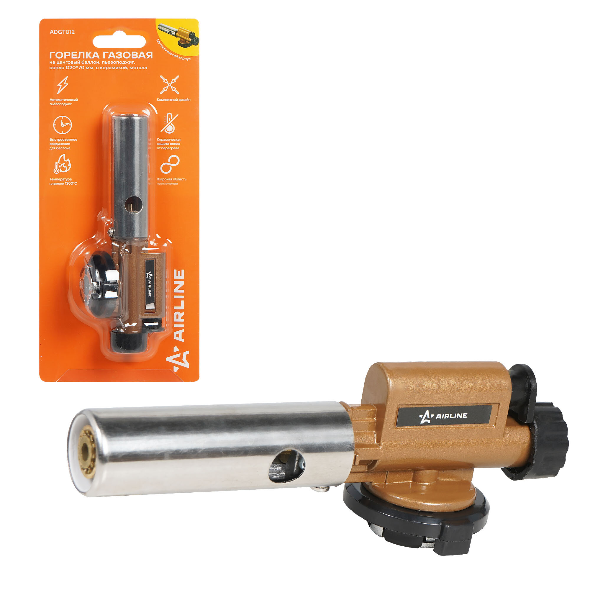 Горелка газовая на цанговый баллон, пьезоподжиг, сопло D20*70 мм, с керамикой, металл ADGT012 AIRLINE информация: