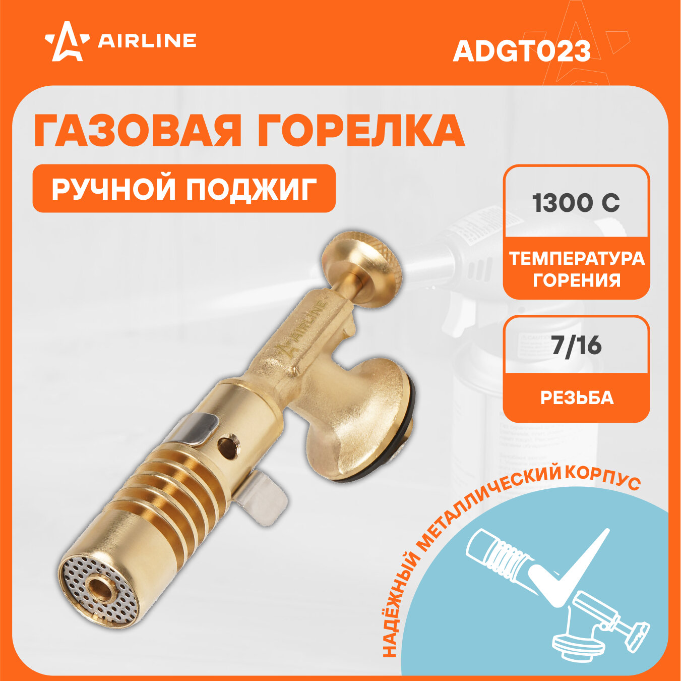 Горелка газовая на резьбовой баллон, ручн.поджиг, сопло D20*60мм, регулят. воздуха, латун.клапан ADGT023 AIRLINE информация: