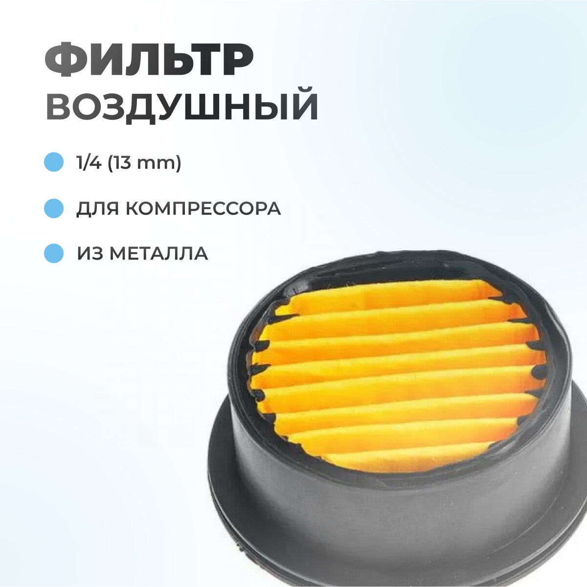 | Дополнительная информация | Фильтр воздушный для компрессора резьба 1/4-13мм (корпус металл) |