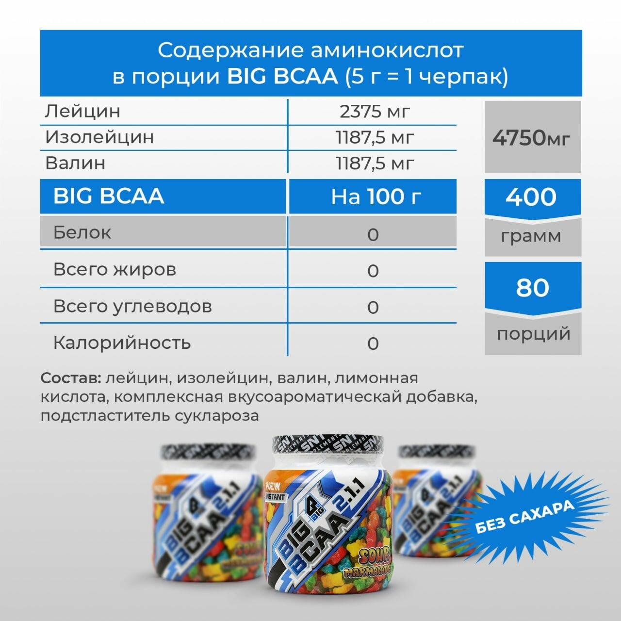 BCAA 2:1:1 BIGSNT спортивное питание / комплекс незаменимых аминокислот для роста мышц, порошок, 400 г (80 порций), вкус Мармелад информация: