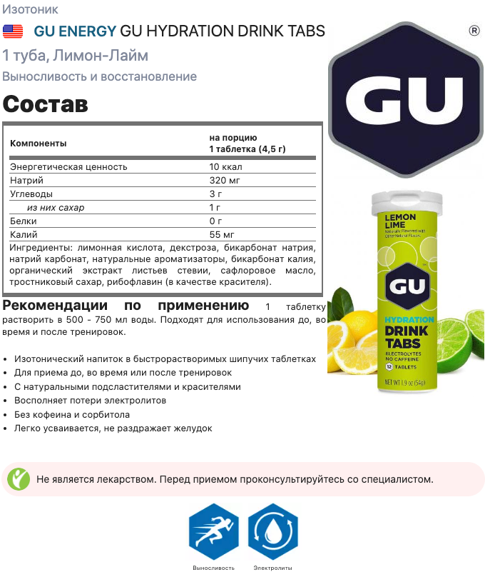 Мы выбрали 10 лучших цен на Изотоник GU ENERGY GU HYDRATION DRINK TABS 1 туба, Лимон-Лайм. Перед тем как купить Изотоник GU ENERGY GU HYDRATION DRINK TABS 1 туба, Лимон-Лайм посмотрите найденные предложения из Яндекс Маркета и других сайтов на основе XML фидов.