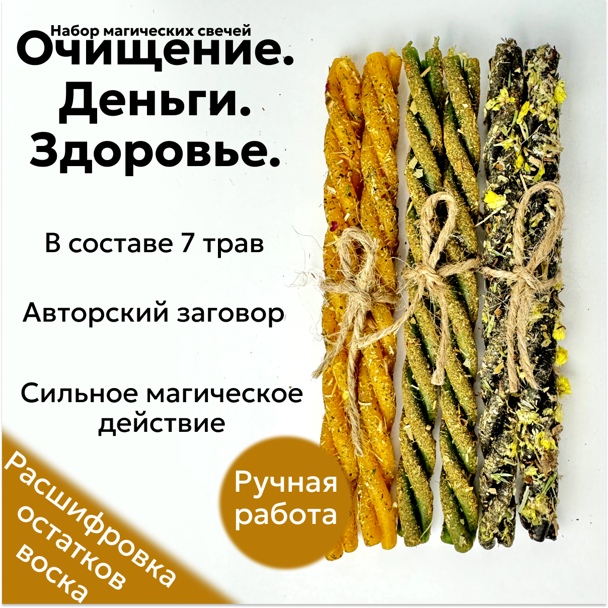 Магические скрутки свечи с травами для ритуалов на очищение, здоровье и деньги набор 6 шт. информация: