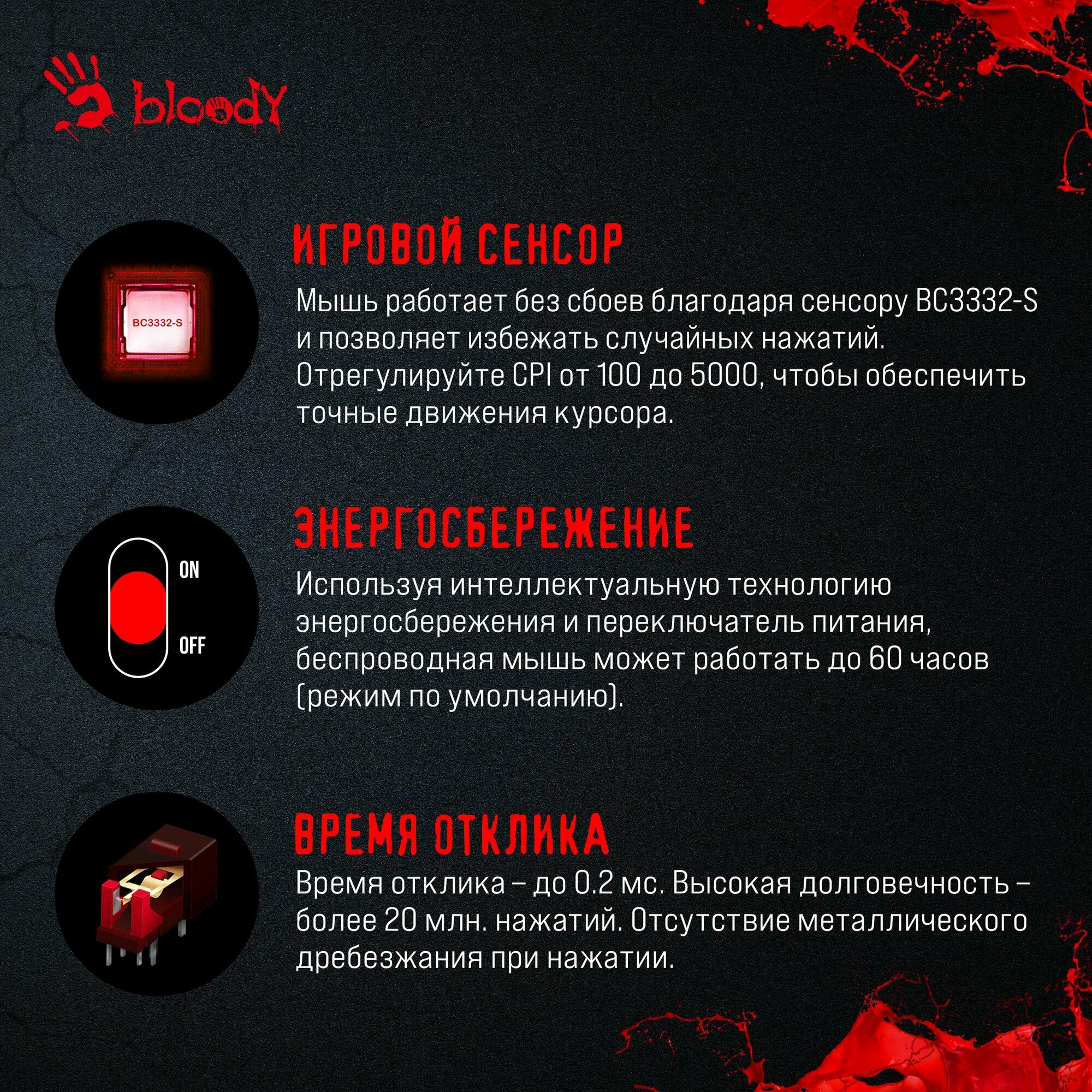 | Особенности | 1мсек скорость срабатывания / Игровой сенсор / Игровой сенсор / 1мсек скорость срабатывания / металлические ножки. / Колесо прокрутки / металлические ножки / металлические ножки. |