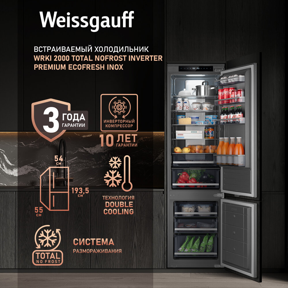 Встраиваемый холодильник с инвертором Weissgauff WRKI 2000 Total NoFrost Inverter Premium Ecofresh Inox Премиум отделка камеры, Зона свежести, Супер заморозка, Супер охлаждение, Сенсорное управление, LED-подсветка информация: