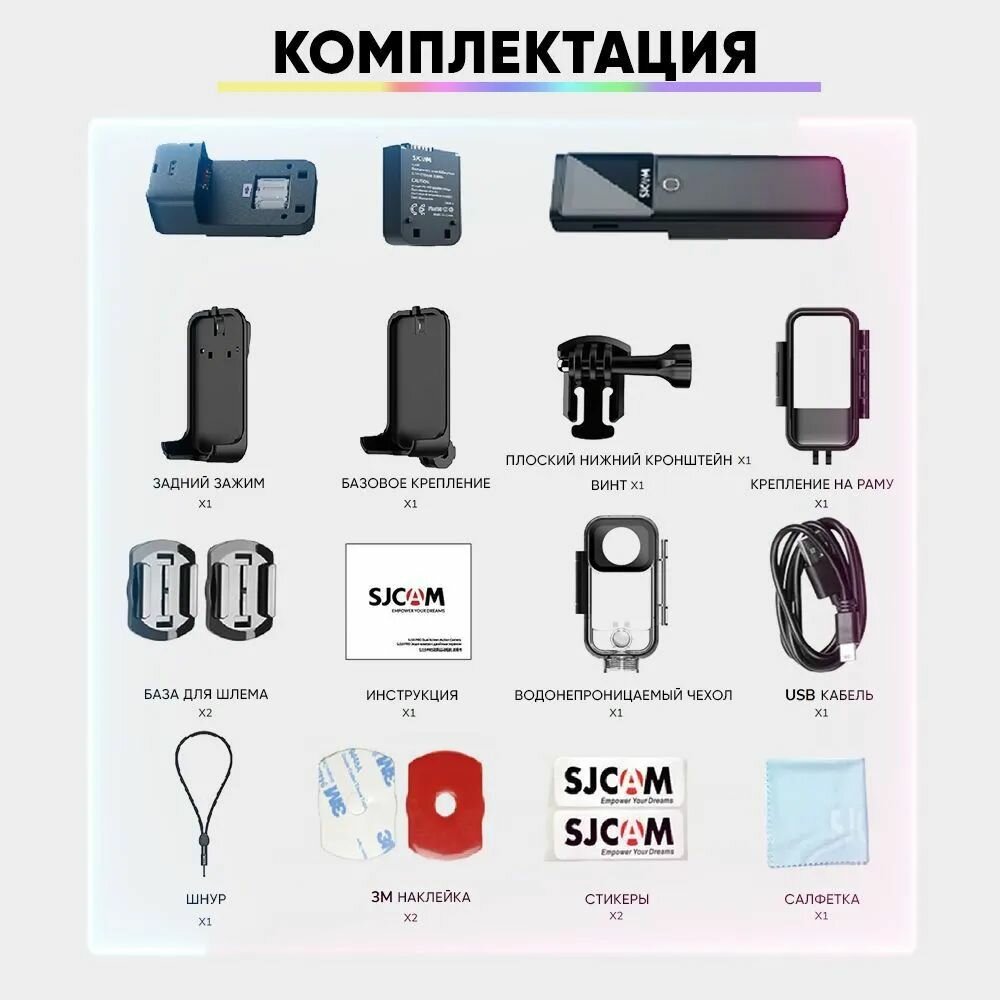 | Комплектация | кабель USB - Type-C - 1 шт, водонепроницаемый кейс - 1 шт, крепление на раму - 1 шт, 3М наклейки- 2 шт, задний зажим - 1 шт, базовое крепление - 1 шт, плоский нижний кронштейн - 1 шт, шнур - 1 шт, подставка для шлема - 2 шт, аккумулятор - 2 шт, салфетка для оптики - 1 шт, стикеры - 2 шт, инструкция на русском языке - 1 шт |