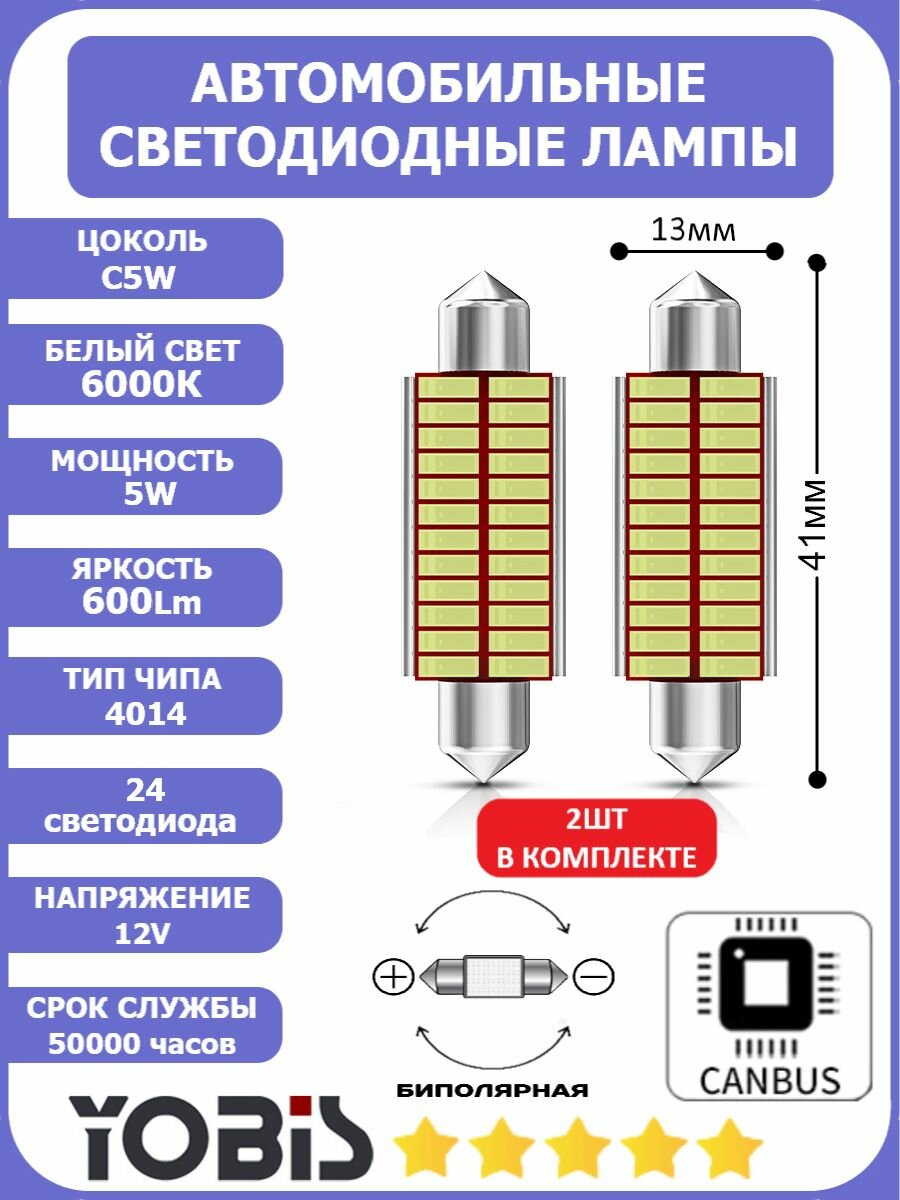 Светодиодная LED лампа С5W, 41мм, 12V, с обманкой CANBUS, 2шт. в комплекте