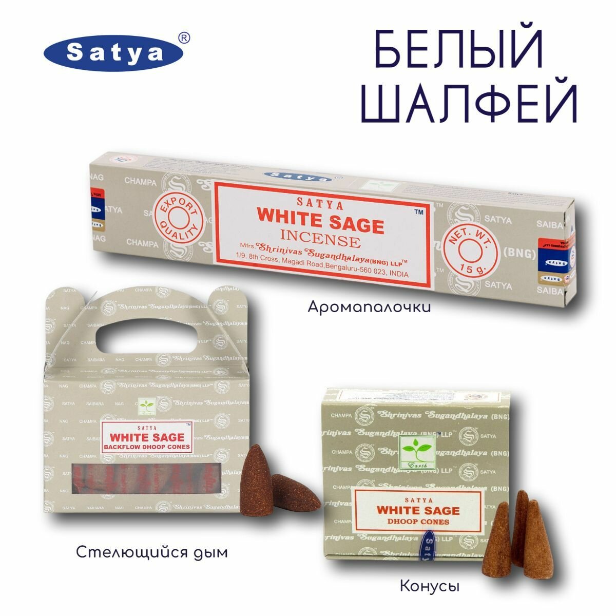 Набор Satya Белый Шалфей - палочки 15 гр, конусы 12 шт, пули (стелющийся дым) 24 шт, ароматические благовония - White Sage - Сатия, Сатья информация: