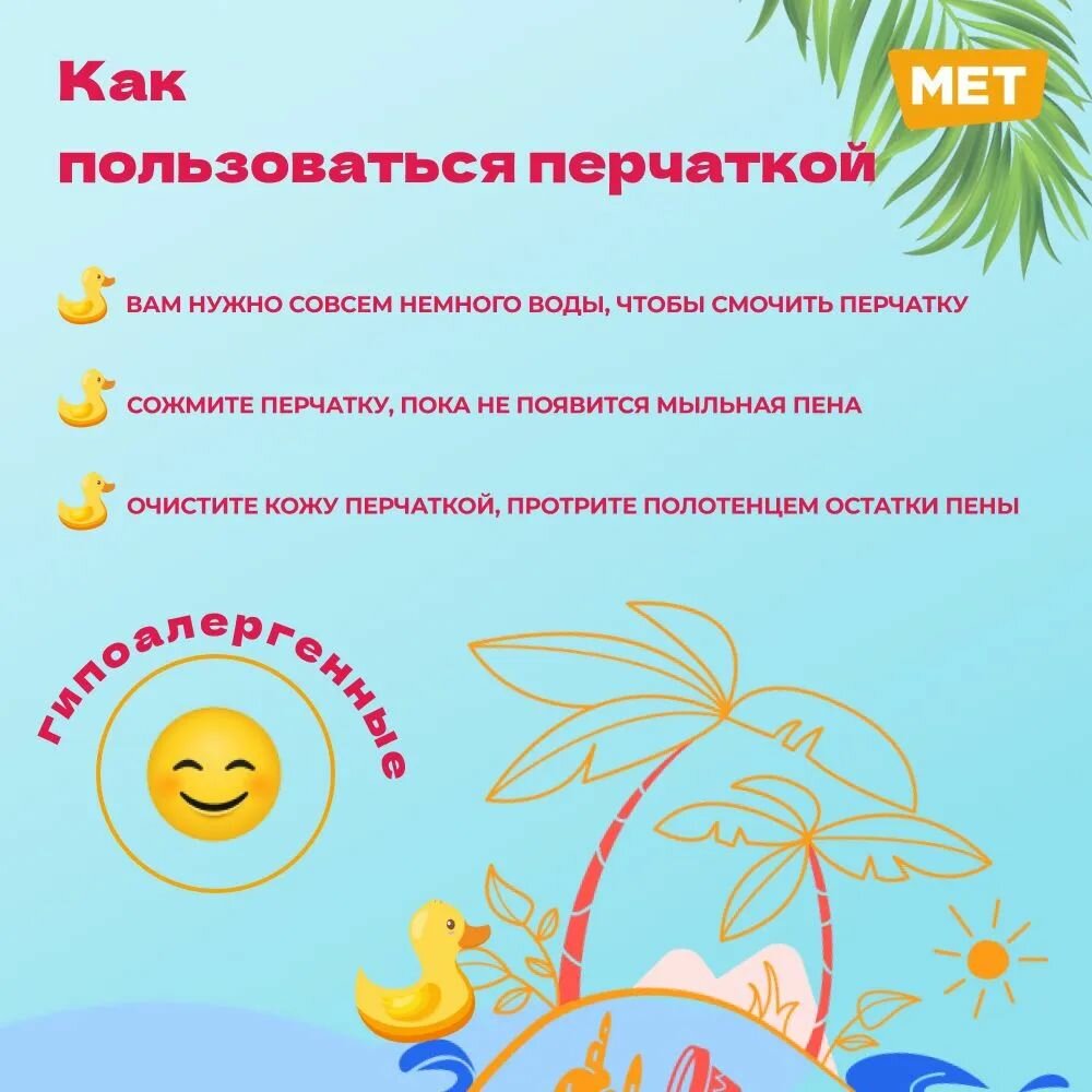 | Способ применения | Для использования понадобится совсем немного воды, чтобы смочить перчатку. Сожмите увлаженную перчатку несколько раз, пока не появится мыльная пена. Очистите кожу перчаткой, протрите полотенцем от остатков пены. Повторному использованию перчатка не подлежит. |