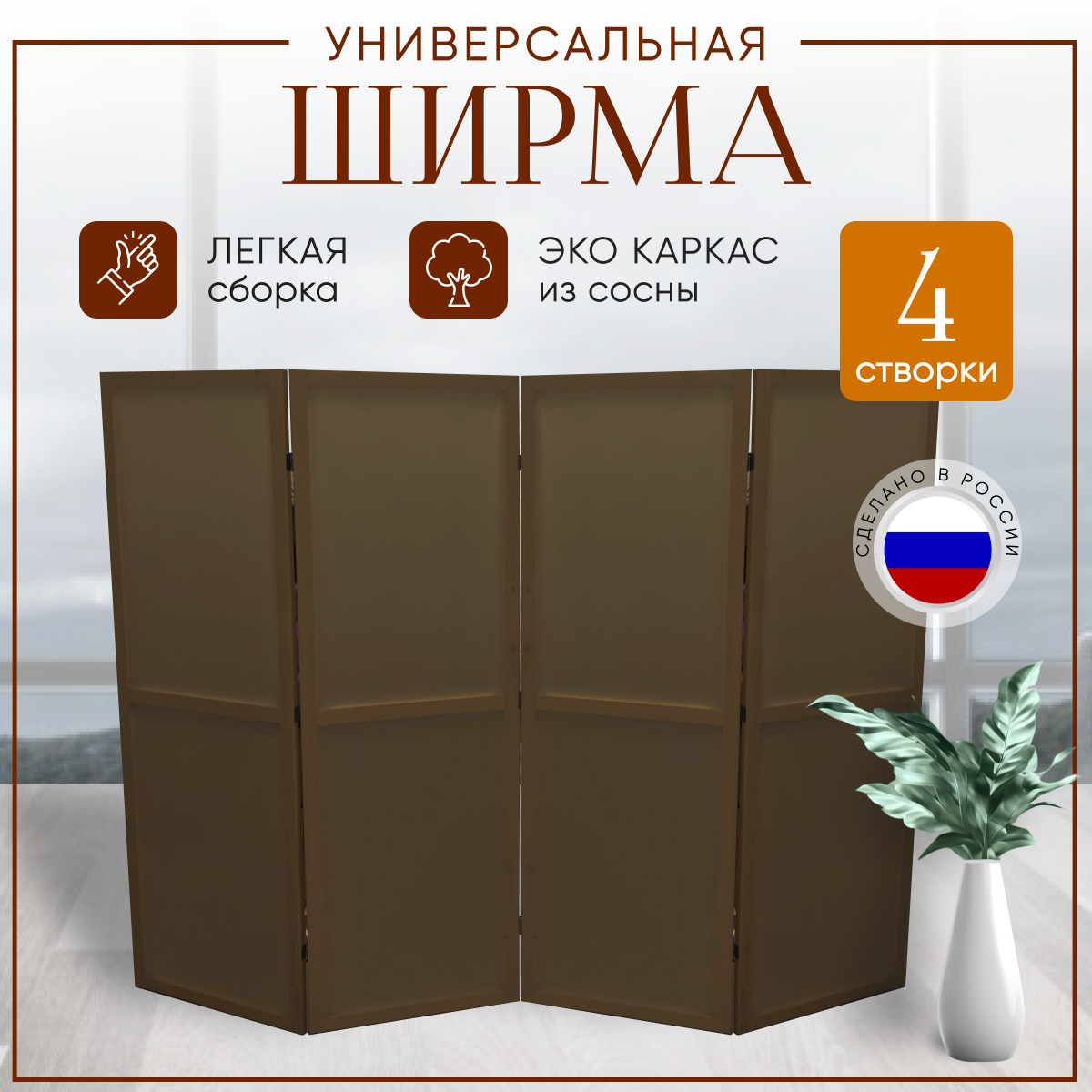 Ширма перегородка складная 4 створки Коричневая информация: