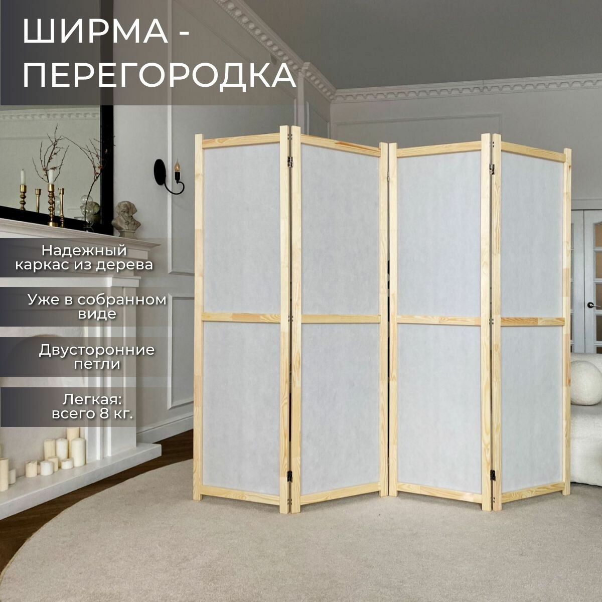 Отзывы на Ширма перегородка для зонирования комнаты. Рама из натурального дерева. 4 створки. Цвет белый.