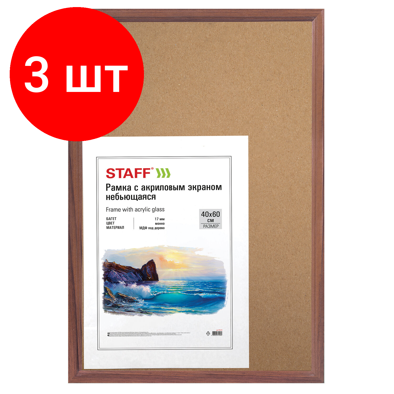 Отзывы на Набор из 3 шт, Рамка деревянная 40х60 см с акриловым стеклом, небьющаяся, багет 17 мм, мокко, STAFF "Carven", 391223