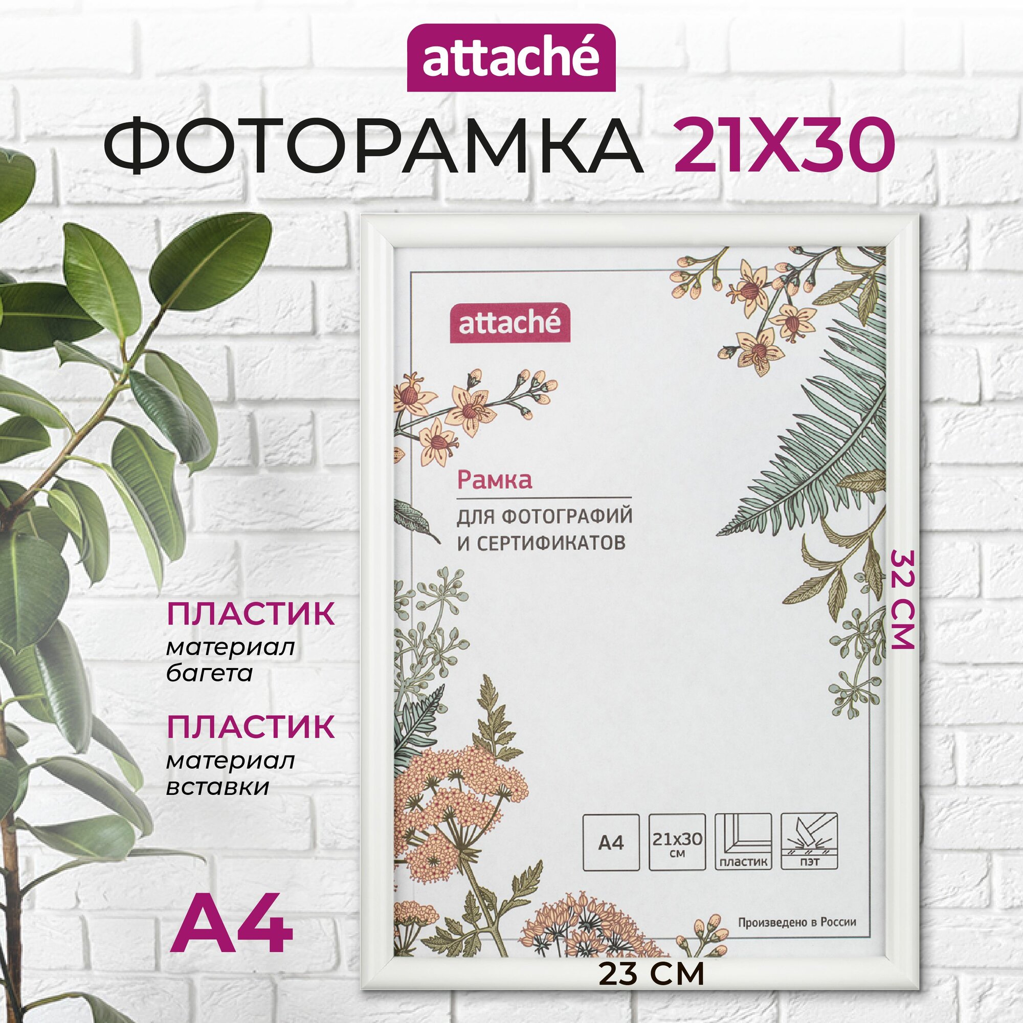 Рамка для фото Attache, А4, 21 x 30 см, пластиковый багет 14 мм, белая информация: