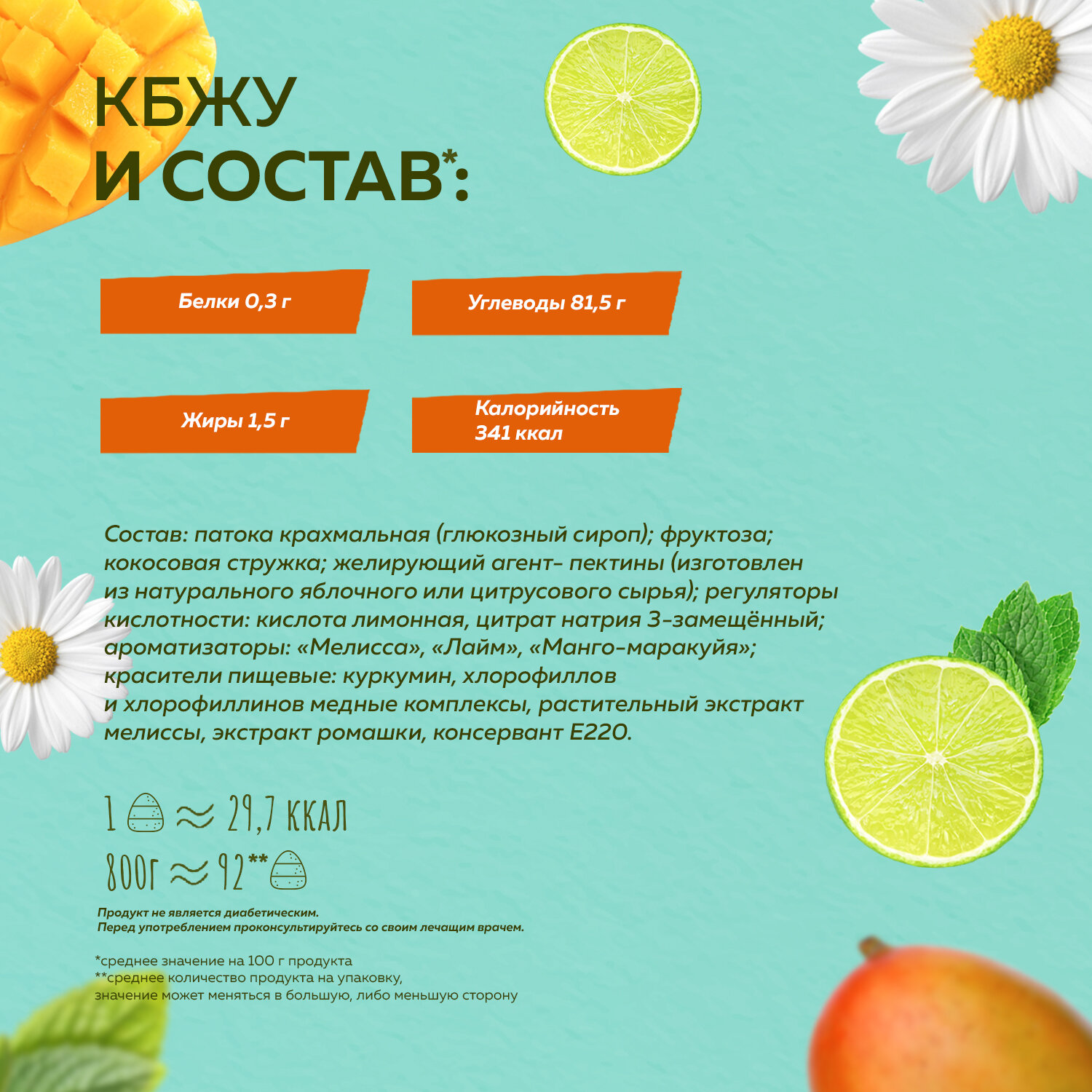 | Состав | патока крахмальная (глюкозный сироп); фруктоза; кокосовая стружка; желирующий агент- пектин (изготовлен из натурального яблочного или цитрусового сырья); регуляторы кислотности: кислота лимонная, цитрат натрия 3-замещённый; ароматизаторы: «Мелисса», «Лайм»; красители натуральные пищевые: куркумин, хлорофиллов и хлорофиллинов медные комплексы, растительный экстракт мелиссы, консервант Е220 |