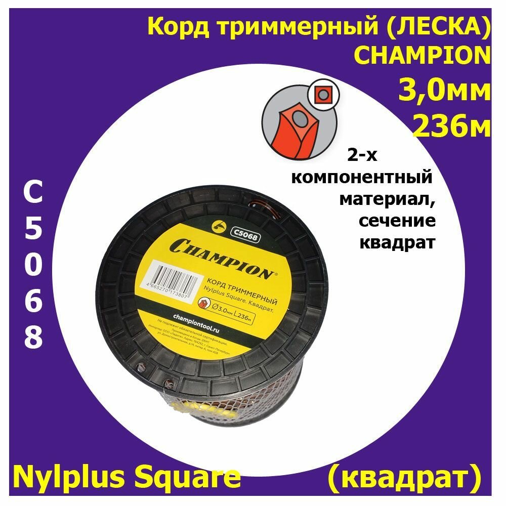 Корд трим. CHAMPION Nylplus Square 2.4мм* 15м (квадрат) / Леска для триммера 240 ₽