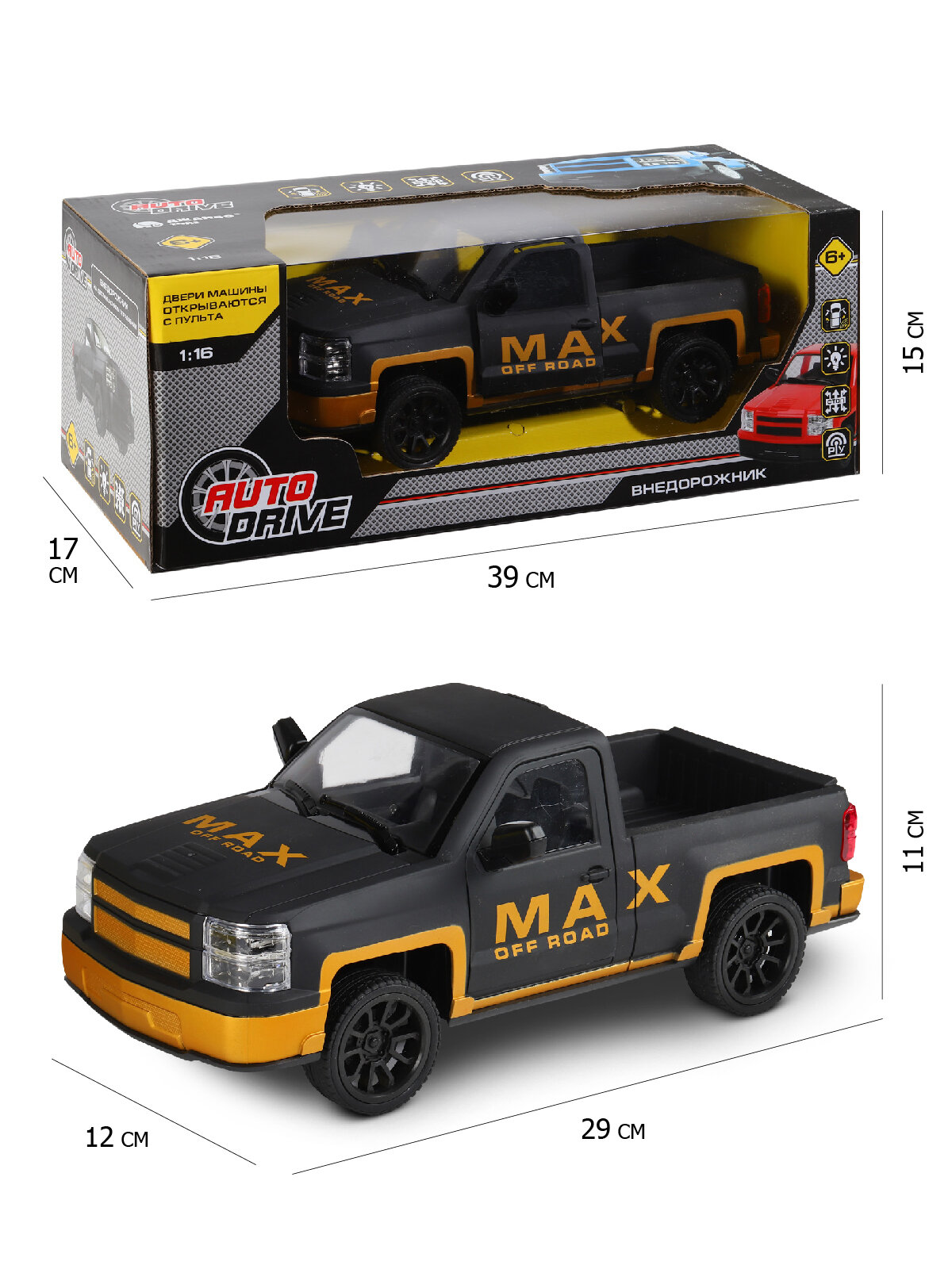 Отзывы на Игрушка на радиоуправлении AUTODRIVE Пикап 1:16 5 каналов открываются двери световые эффекты желтый JB1168123