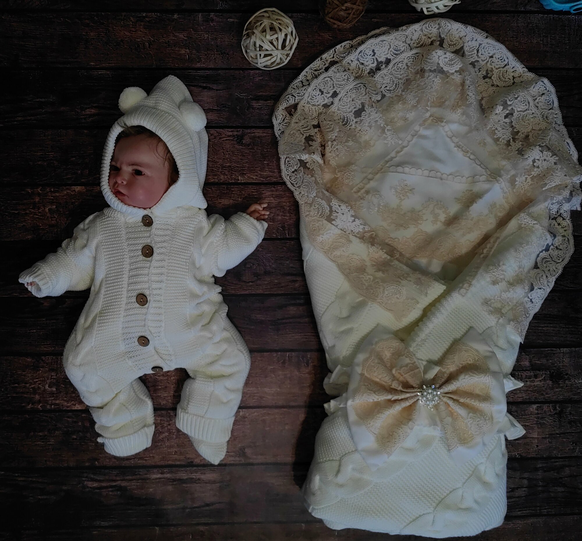 Вязанный конверт с комбинезоном для новорожденного информация: