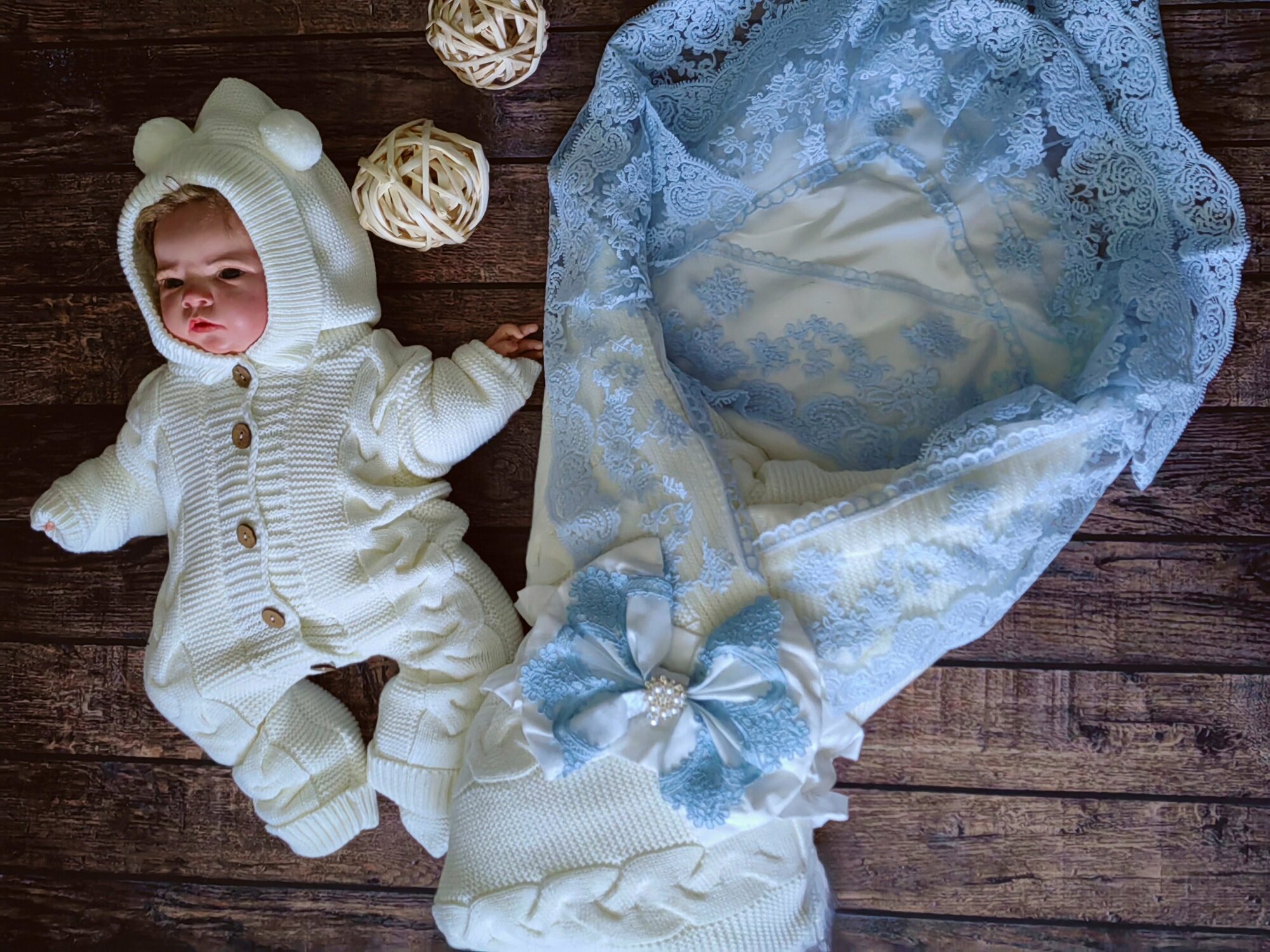 | Состав комплекта | конверт плед, комбинезон вязанный, уголок,резинка бант |