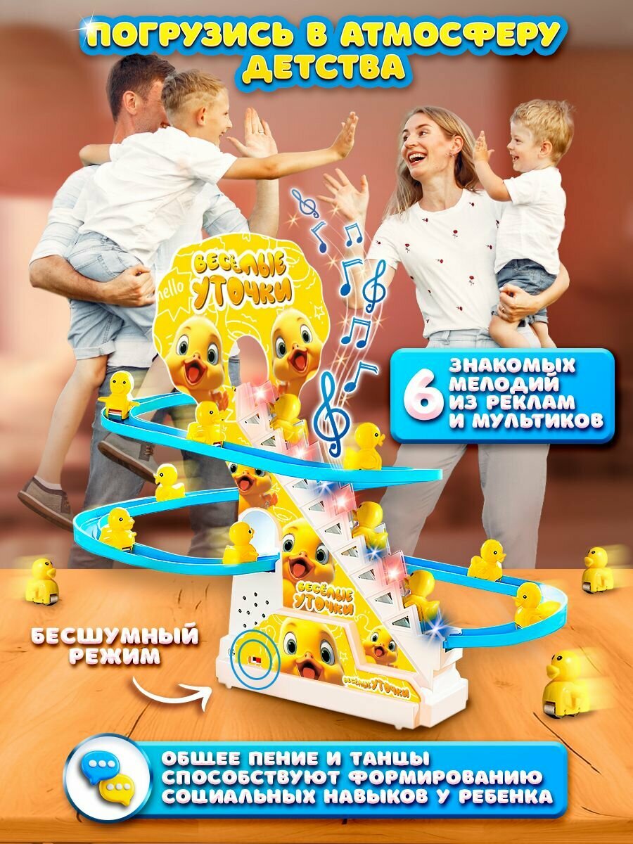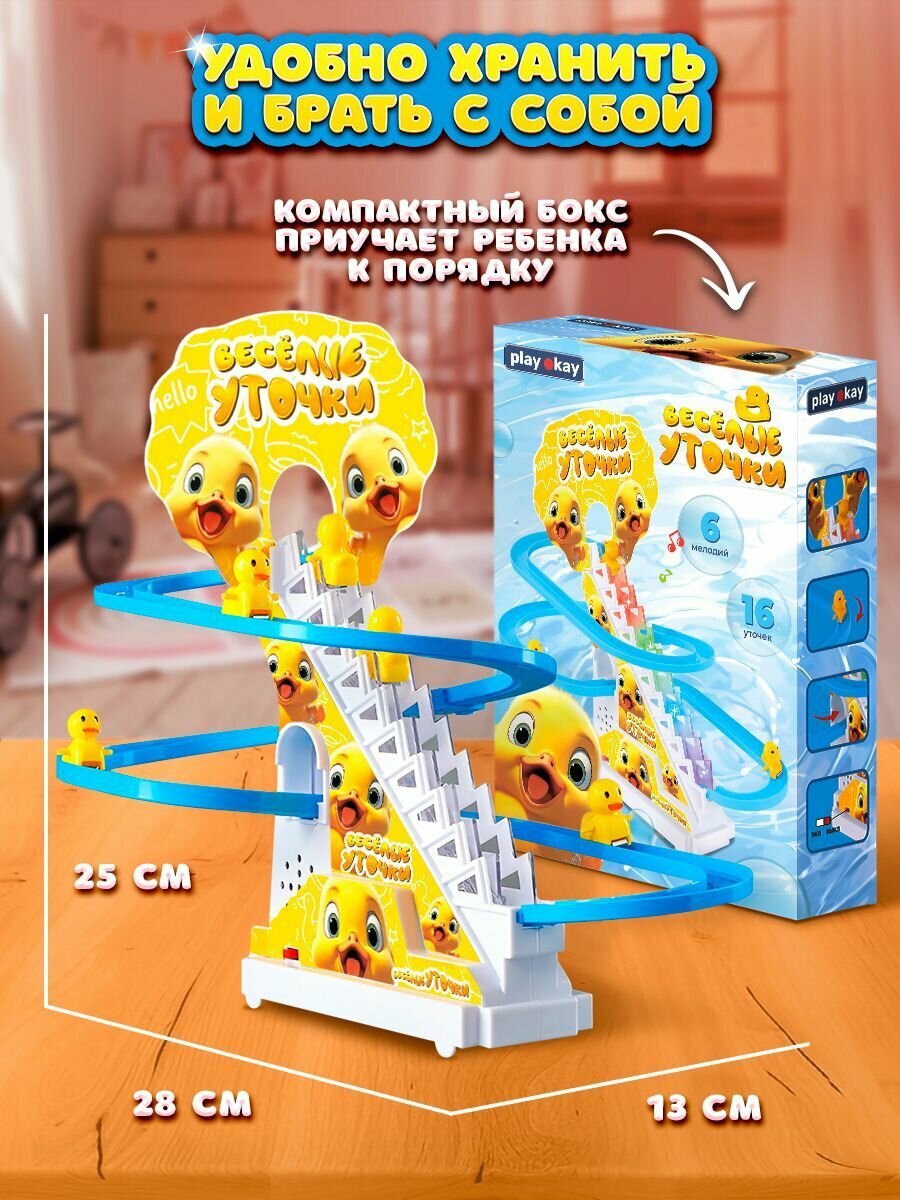 Антистресс игрушка Play Okay развивающая для малышей, игровой набор бегающие уточки по лестнице, музыкальная и световая, питание от батареек информация: