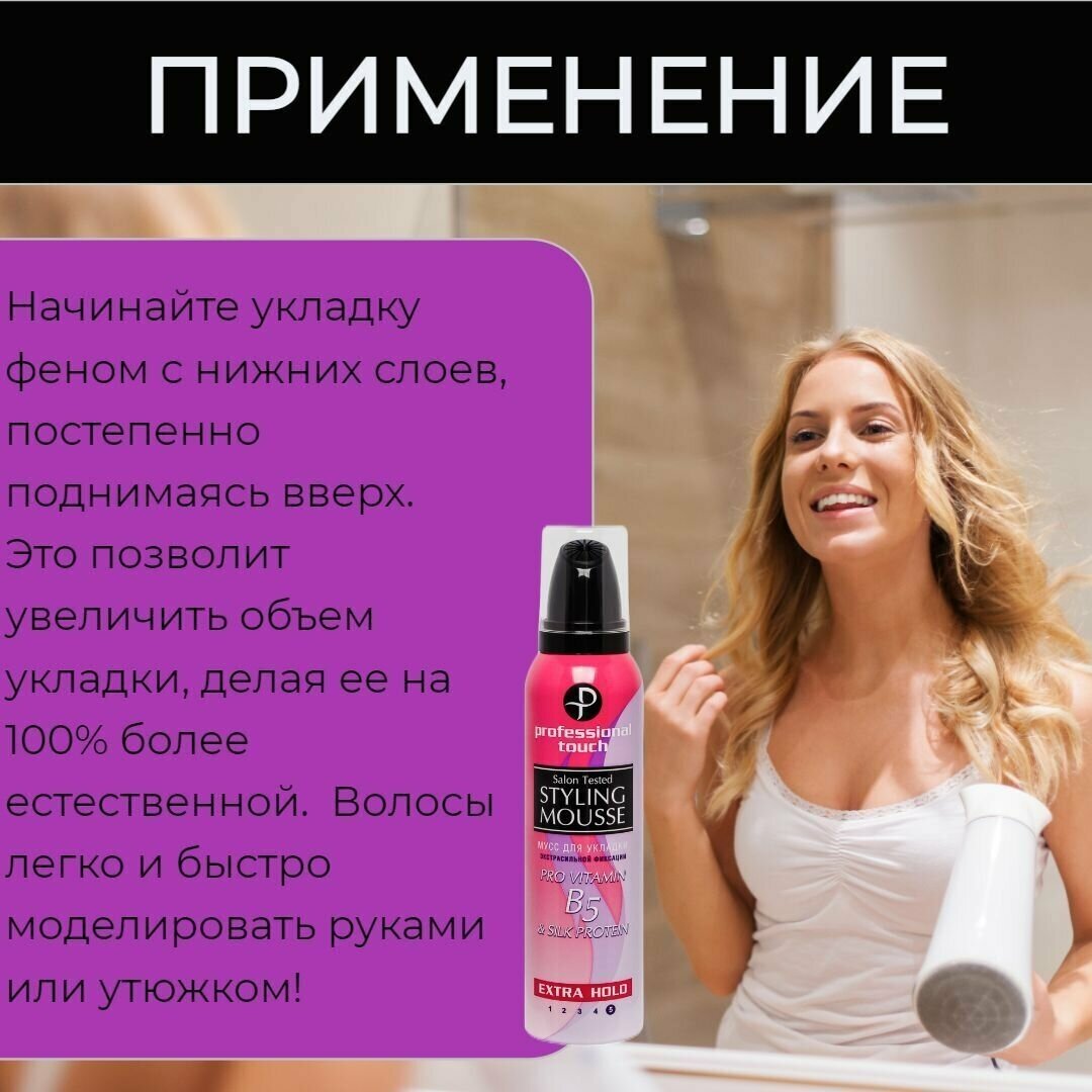 PROFESSIONAL TOUCH Мусс для укладки волос Pro-Vitamin B5& Silk Protein, экстрасильная фиксация, 150 мл, 2 шт 724 ₽