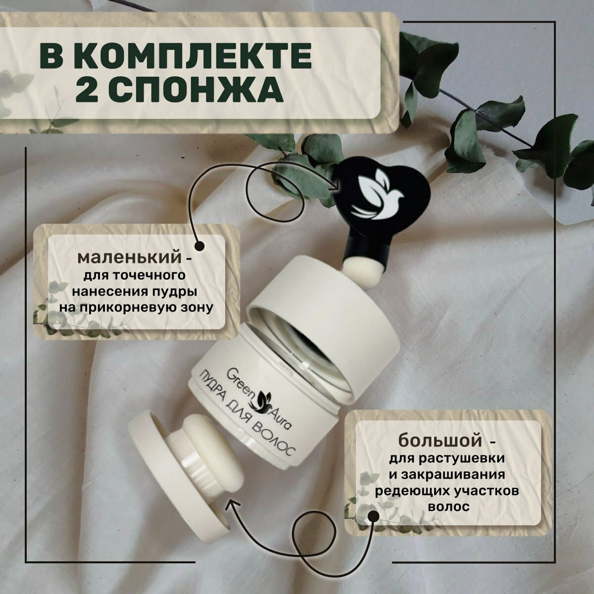 Пудра для волос от седины GreenAura коричневая с двумя спонжами 588 ₽