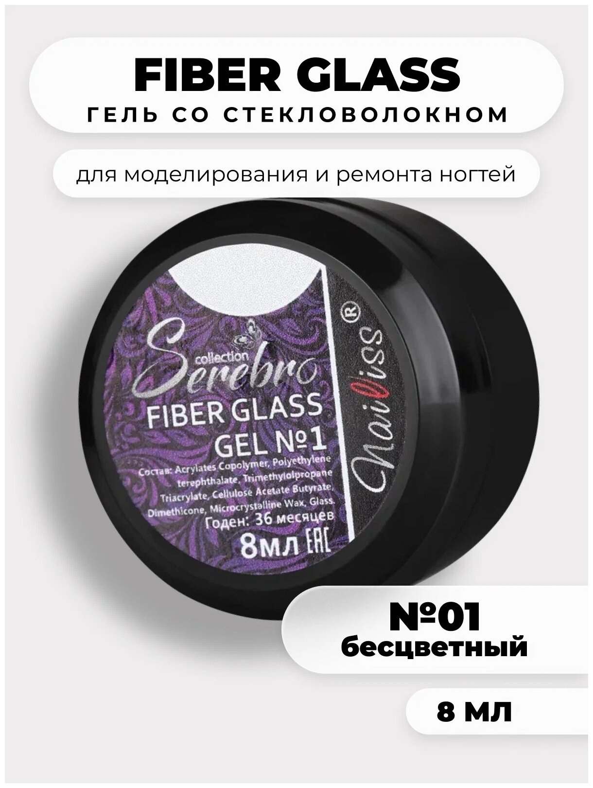Гель для ногтей Serebro со стекловолокном, для наращивания и укрепления, прозрачный, 8 мл информация: