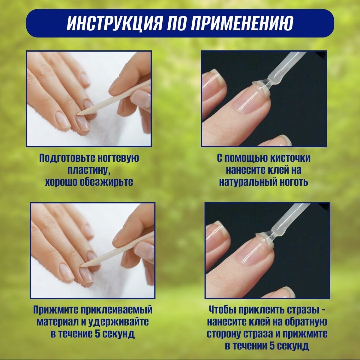 | Способ применения | ИНСТРУКЦИЯ ПО ПРИМЕНЕНИЮ: Подготовьте ногтевую пластину: отодвиньте кутикулу апельсиновой палочкой, пройдите ноготь бафом и хорошо обезжирьте. Далее с помощью кисточки нанесите на натуральный ноготь клей тонким слоем, прижмите приклеиваемый материал и удерживайте в течении 5 сек. Если вы хотите украсить ноготь стразами, просто нанесите клей на обратную сторону страза. ДЛЯ БЕЗОПАСНОГО УДАЛЕНИЯ ТИПС необходимо воспользоваться одним из следующих способов: 1) Распаривание в горячей воде (подержать ногти 5-7 минут в горячей воде и при помощи апельсиновой палочки аккуратно удалить ноготь) |