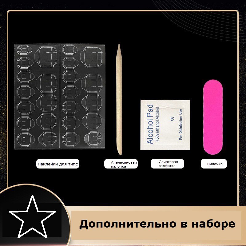 | Подробная комплектация | накладные ногти 24 шт., клей 1 шт.,набор 1 шт.(наклейки для типс,пилочка,апельсиновая палочка,спиртовая салфетка). |