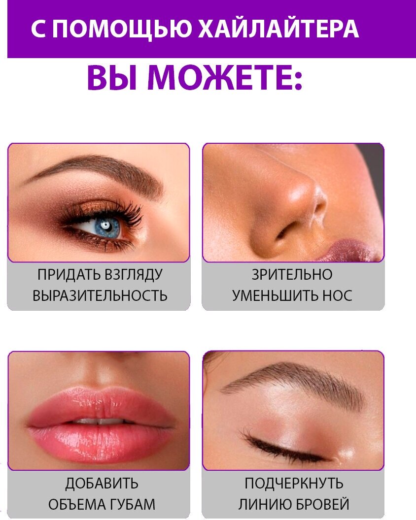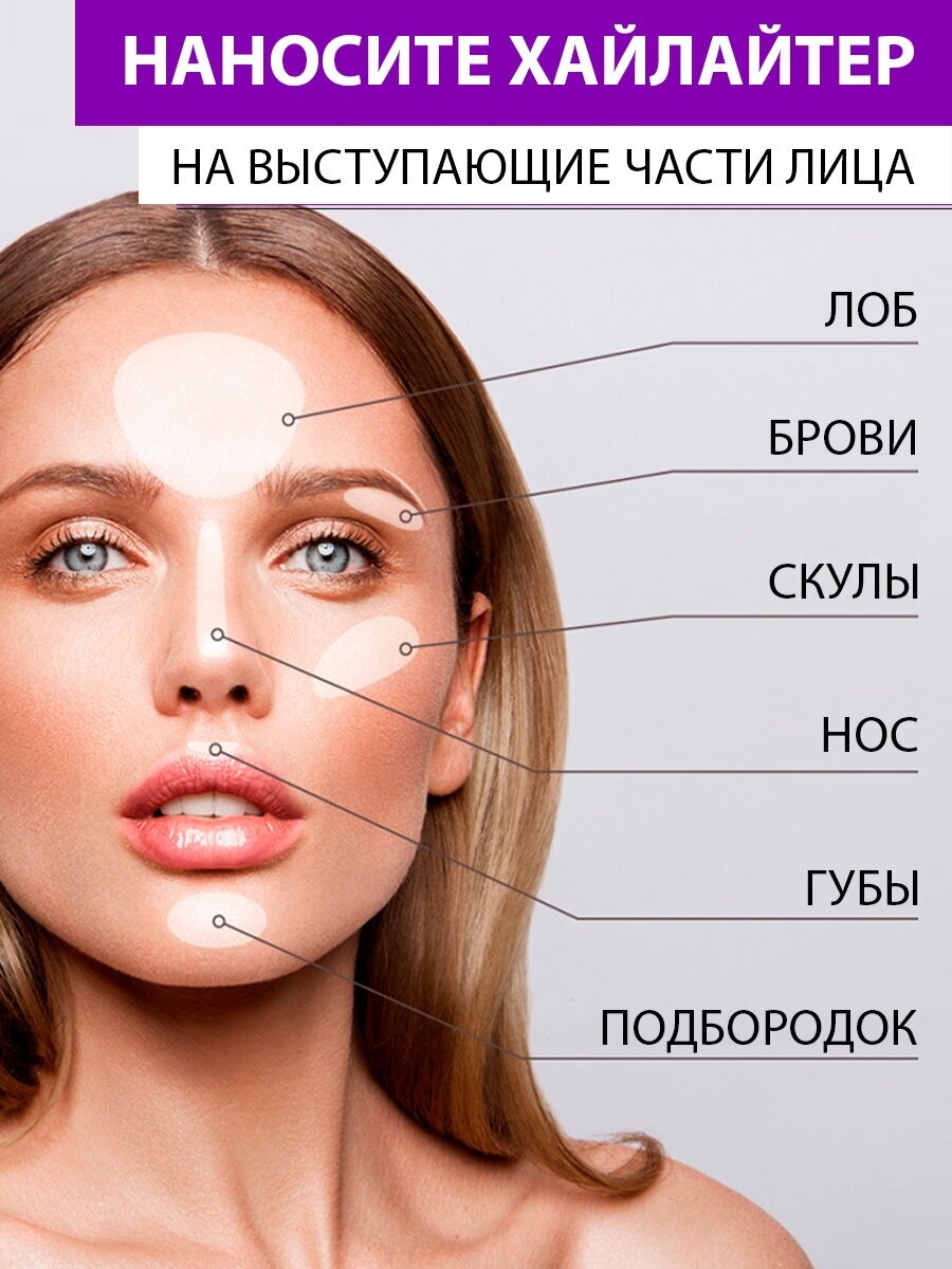 | Способ применения | Способ применения: чтобы сияние хайлайтеров сделать более видимым или интенсивным, нанесите сверкающую пудру при помощи влажной кисти, предварительно увлажненной спреем для фиксации макияжа. Нанесите на кожу лица с помощью кисточки. Участки нанесения выбираются в зависимости от того, какой визуальный эффект должен быть достигнут: если добавить хайлайтер на косточки под глазами - темные круги исчезнут на область над бровями и виски - лоб станет выше и шире; на контур верхней губы - их объем увеличится; в центр верхнего века, во внутренний уголок глаз и на линию под бровями - взгляд станет лучистым; на спинку носа - он сузится. |