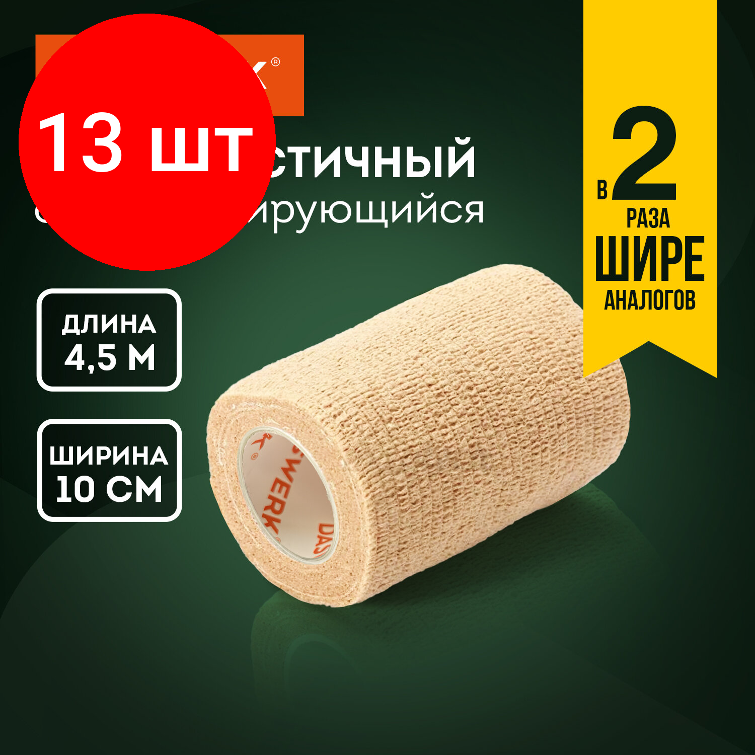 Комплект 13 шт, Бинт эластичный бандажный защитный самофиксирующийся, 4.5м*10см, 1 рул., бежевый, DASWERK, 680043 информация: