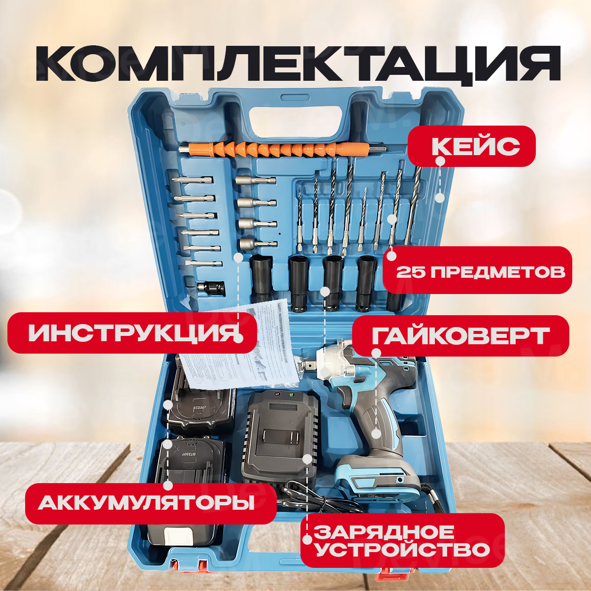 | Комплектация | Гайковерт 1шт Аккумулятор 2шт Зарядное устройство 1шт Инструкции по безопасности Кейс Набор насадок 25шт |
