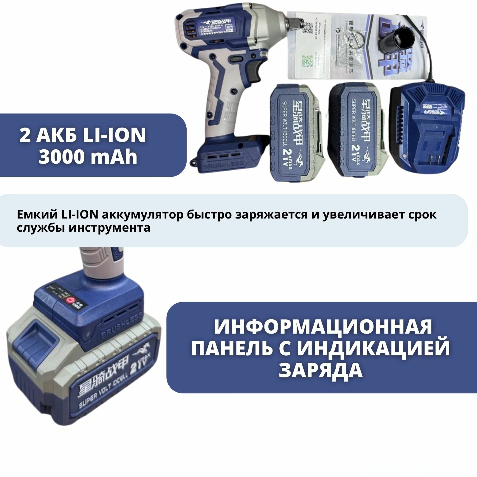 | Комплектация | Гайковерт- 1 шт. АКБ - 2 шт. Инструкция - 1 шт. Кейс - 1 шт. Зарядная станция - 1 шт. Ударная головка 22 мм - 1 шт. |